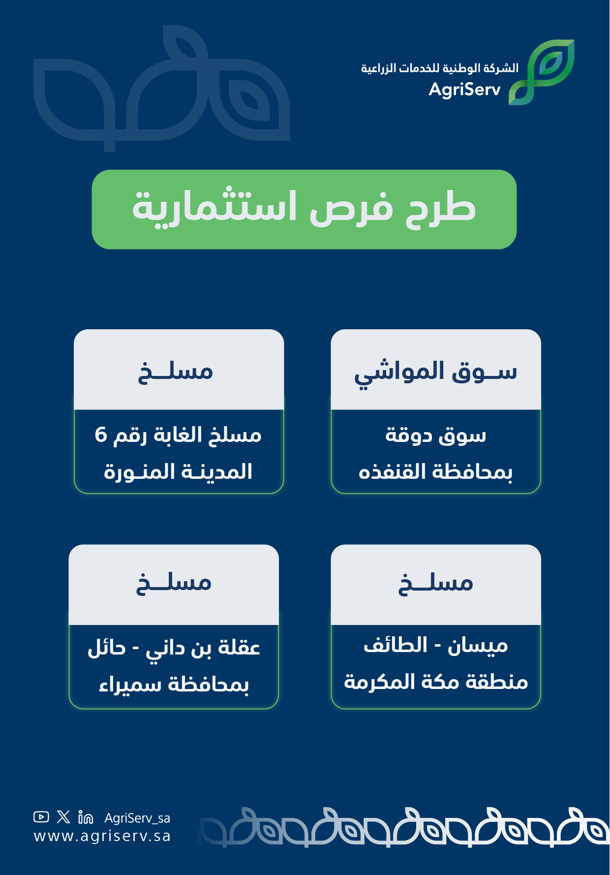 صراحة – الرياض: أعلنت الشركة الوطنية للخدمات الزراعية عن طرح عدد من الفرص الاستثمارية في أسواق النفع العام والمسالخ على منصة فرص وعلى موقع الشركة من خلال الرابط: agriserv.sa/portal/investm
