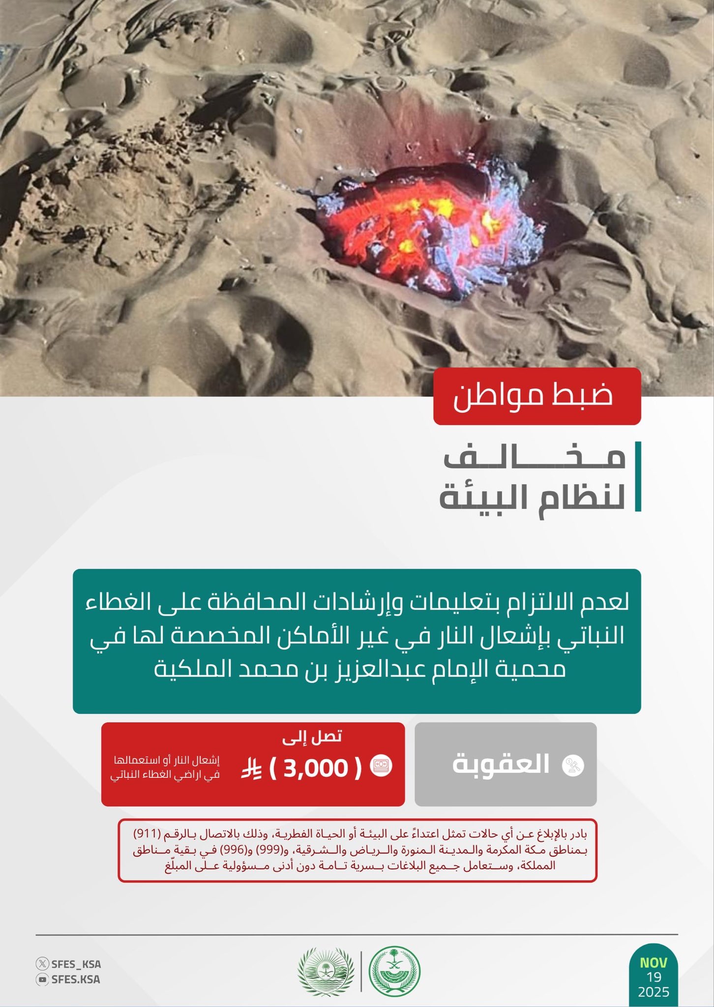 وأكدت القوات أن عقوبة إشعال النار في غير الأماكن المخصصة لها في الغابات والمتنزهات الوطنية غرامة تصل إلى (3,000) ريال، حاثة على الإبلاغ عن أي حالات تمثل اعتداءً على البيئة أو الحياة الفطرية على الرقم (911) بمناطق مكة المكرمة والمدينة المنورة.
