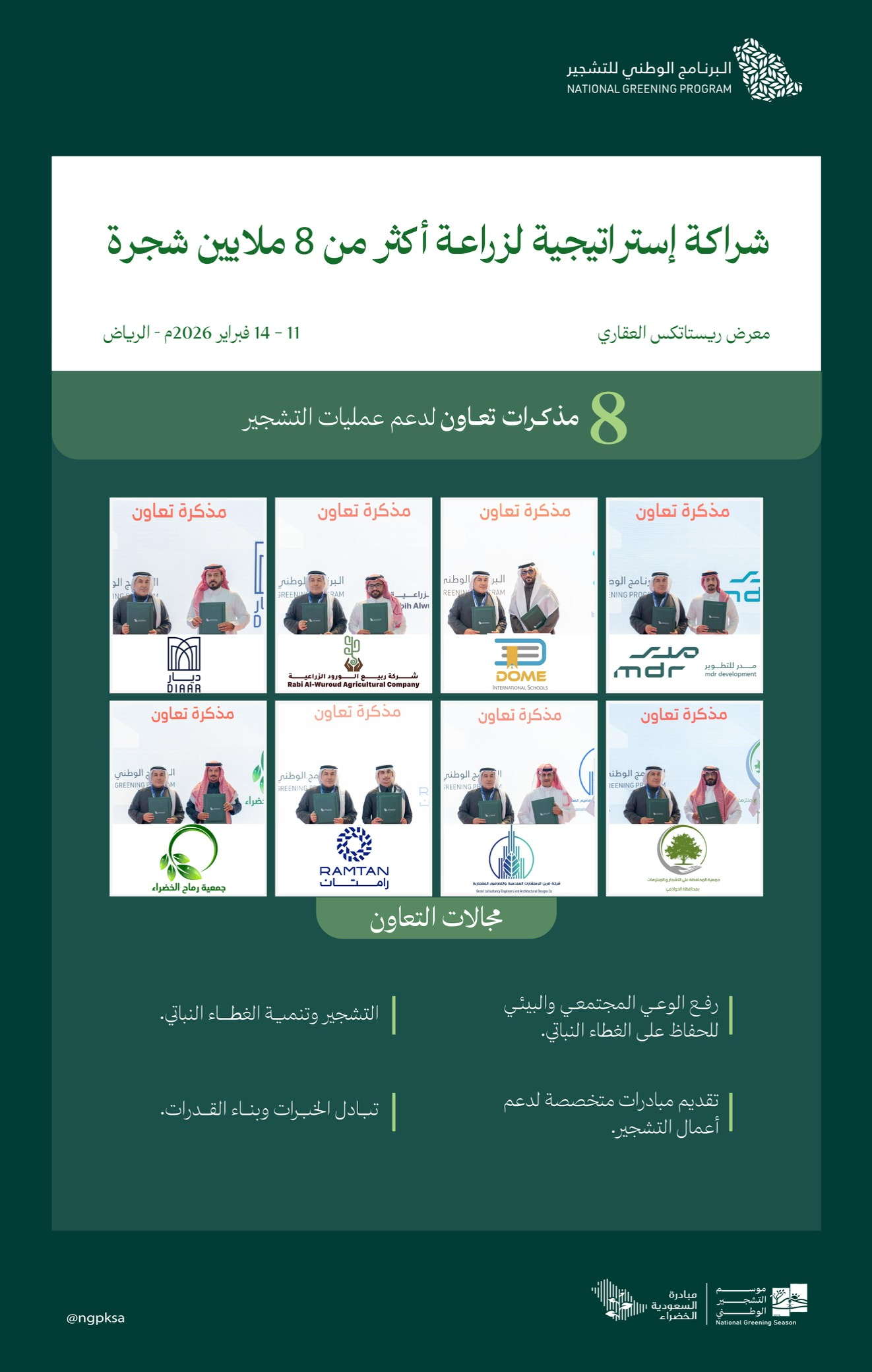 وقّع البرنامج الوطني للتشجير 8 مذكرات تعاون مع عددٍ من الجمعيات والجهات والشركات العاملة في المجال العقاري، لزراعة أكثر من 8 ملايين شجرة، للإسهام في تعزيز عمليات التشجير في مناطق المملكة كافة، ودعم الجهود الوطنية لتنمية الغطاء النباتي ومكافحة التصحر، تماشيًا مع مستهدفات رؤية السعودية 2030 ومبادرة السعودية الخضراء لحماية البيئة وتحقيق استدامتها.
