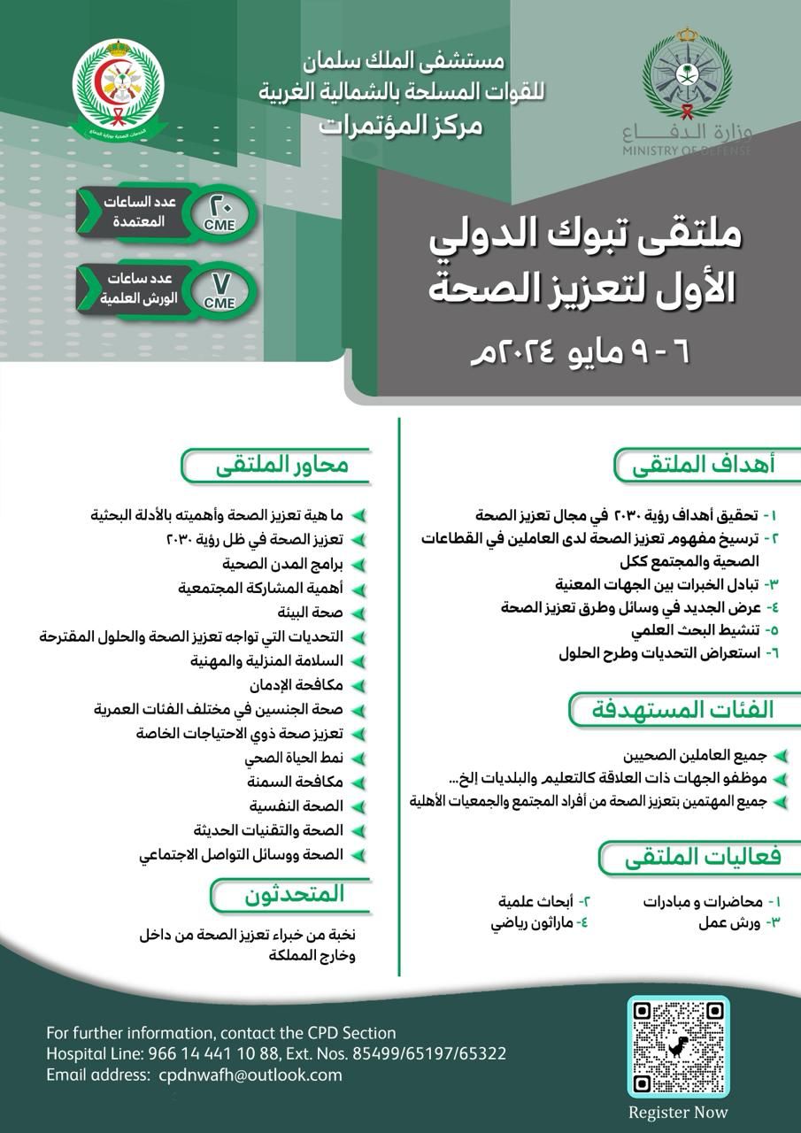 انطلاق #ملتقى_تبوك_الدولي_لتعزيز_الصحة بـ #مستشفى_الملك_سلمان بالشمالية الغربية.. مايو القادم