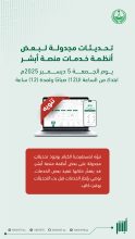 أعلنت منصة وزارة الداخلية الإلكترونية “أبشر” عن إجراء تحديثات لبعض أنظمة خدماتها يوم الجمعة المقبل (5 ديسمبر 2025م) بدءًا من الساعة الـ(12) صباحًا حتى الساعة الـ(12) ظهرًا، وذلك في إطار عملياتها المجدولة لتوفير تجربة مستخدم…