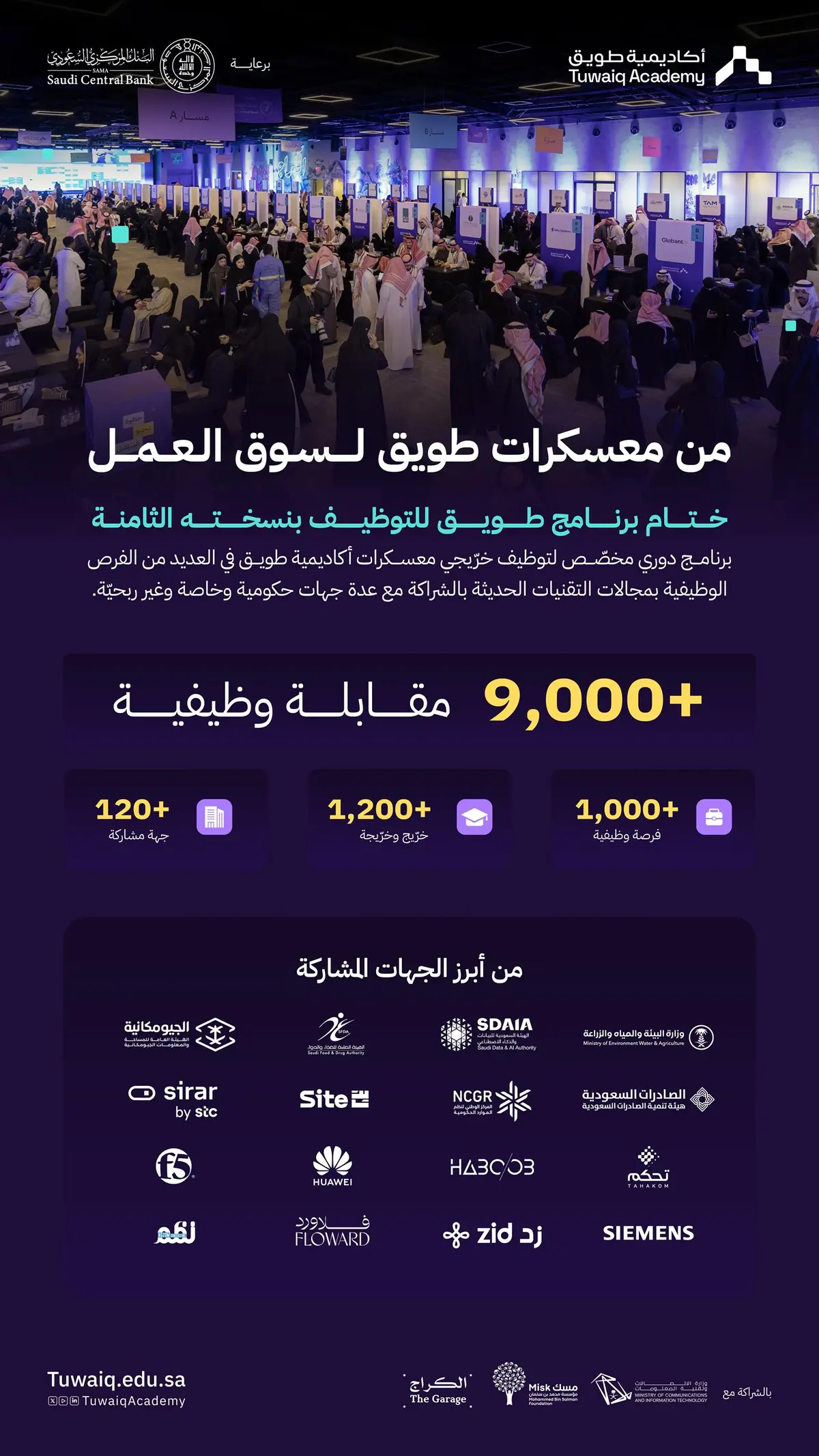 وشهد البرنامج إجراء أكثر من 9,000 مقابلة وظيفية لأكثر من 1,200 خريج وخريجة من معسكرات الأكاديمية، في 1,000 فرصة وظيفية أتاحتها أكثر من 120 جهة من مختلف القطاعات في مجالات: الأمن السيبراني، وتطوير البرمجيات والتطبيقات، وعلوم البيانات والذكاء الاصطناعي، والحوسبة السحابية، وهندسة الميكاترونيكس، وغيرها من مجالات التقنيات المتقدمة.