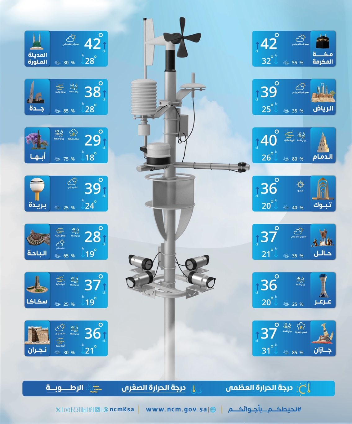 حالة الطقس : رياح مثيرة للغبار وأمطار رعدية على بعض مناطق المملكة #عاجل