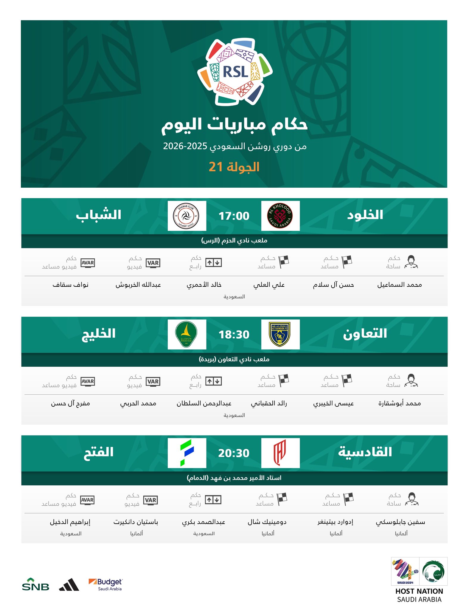 أعلنت لجنة الحكام عن أسماء حكام مباريات اليوم ضمن منافسات الجولة الـ21 من دوري روشن السعودي للمحترفين، حيث أُسندت مهمة إدارة مواجهة الشباب والخلود، المقررة عند الساعة 5:00 مساءً على ملعب نادي الحزم بالرس، إلى طاقم تحكيم بقيادة الحكم محمد السماعيل.