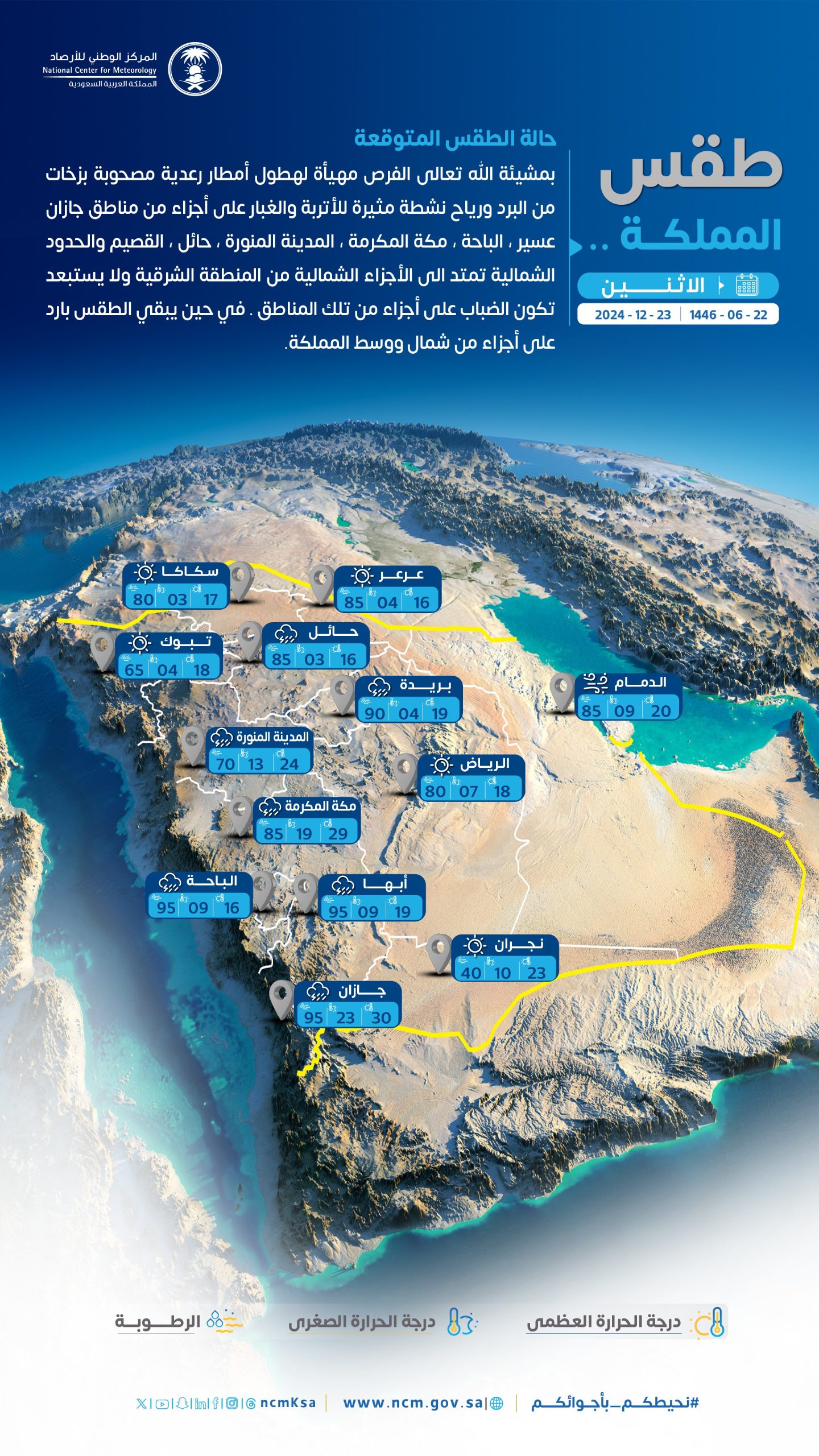| المدينة المنورة | 24 | 13 | 70 | أمطار رعدية / رياح نشطة |