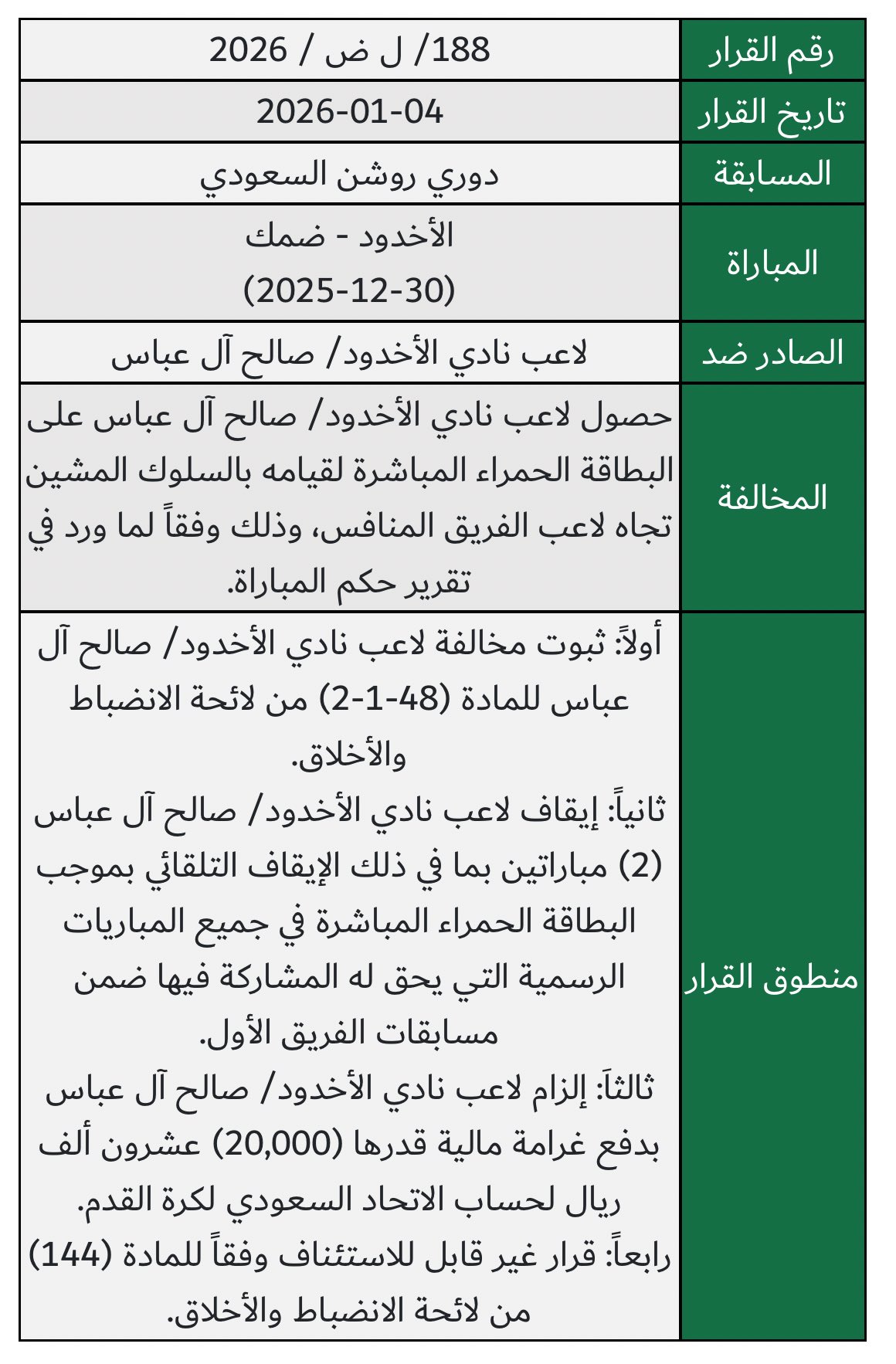 وقررت اللجنة إيقاف لاعب نادي الأخدود صالح آل عباس مباراتين رسميتين (بما في ذلك الإيقاف التلقائي بالبطاقة الحمراء المباشرة) وإلزامه بدفع غرامة مالية قدرها (20,000) عشرون ألف ريال. وجاء هذا القرار عقب ثبوت مخالفته للمادة (4-1-2) من اللائحة بسبب قيامه بـ “السلوك المشين” تجاه لاعب الفريق المنافس خلال مباراة فريقه أمام ضمك.