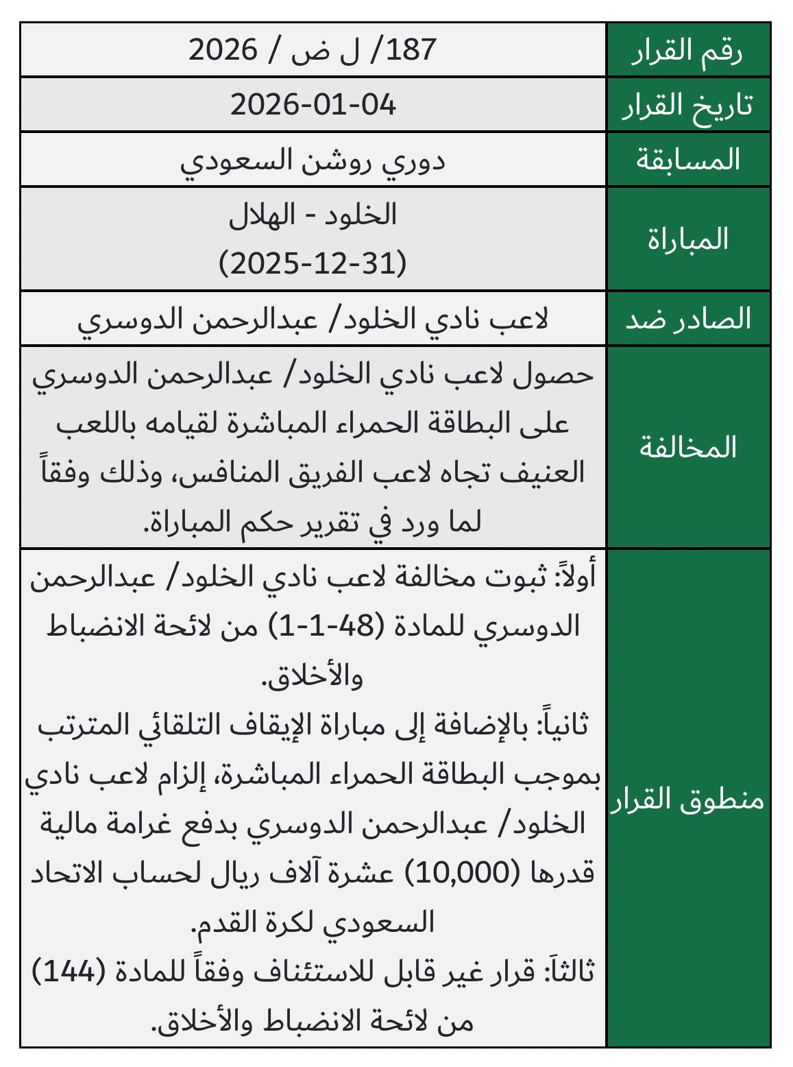وفي قرار منفصل، ألزمت اللجنة لاعب نادي الخلود عبد الرحمن الدوسري بدفع غرامة مالية قدرها (10,000) عشرة آلاف ريال، وذلك بالإضافة إلى مباراة الإيقاف التلقائي المترتبة على حصوله على البطاقة الحمراء المباشرة. وثبتت مخالفة الدوسري للمادة (48-1-1) من اللائحة لقيامه بـ “اللعب العنيف” تجاه لاعب الهلال.