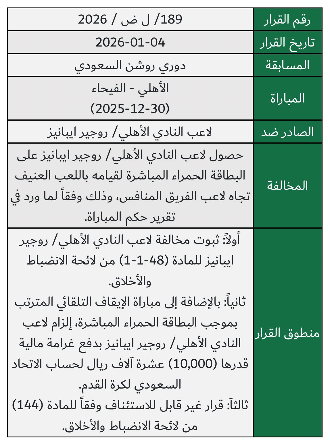 أعلنت لجنة الانضباط والأخلاق في الاتحاد السعودي لكرة القدم عن معاقبة مدافع النادي الأهلي، البرازيلي روجير إيبانيز، إثر طرده في لقاء فريقه الأخير أمام الفيحاء ضمن منافسات دوري روشن السعودي، والذي أقيم بتاريخ 30 ديسمبر الماضي.
