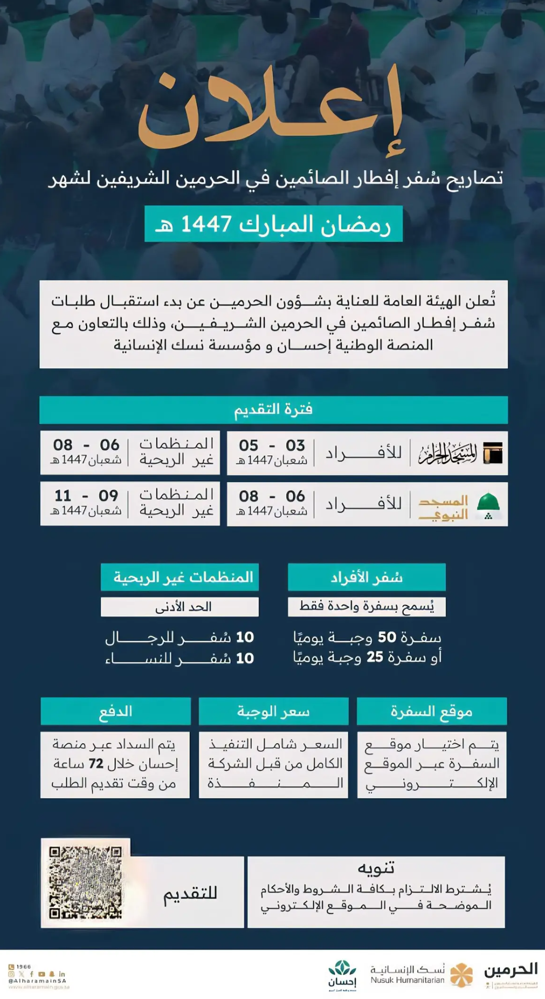 أعلنت الهيئة العامة للعناية بشؤون المسجد الحرام والمسجد النبوي عن بدء استقبال طلبات تصاريح سفر إفطار الصائمين في الحرمين الشريفين لشهر رمضان المبارك لعام 1447هـ، وذلك بالتعاون مع المنصة الوطنية للعمل الخيري “إحسان” ومؤسسة نسك الإنسانية، في إطار جهودها الرامية إلى تنظيم أعمال الإفطار وتقديم الخدمات وفق أعلى معايير الجودة والحوكمة.