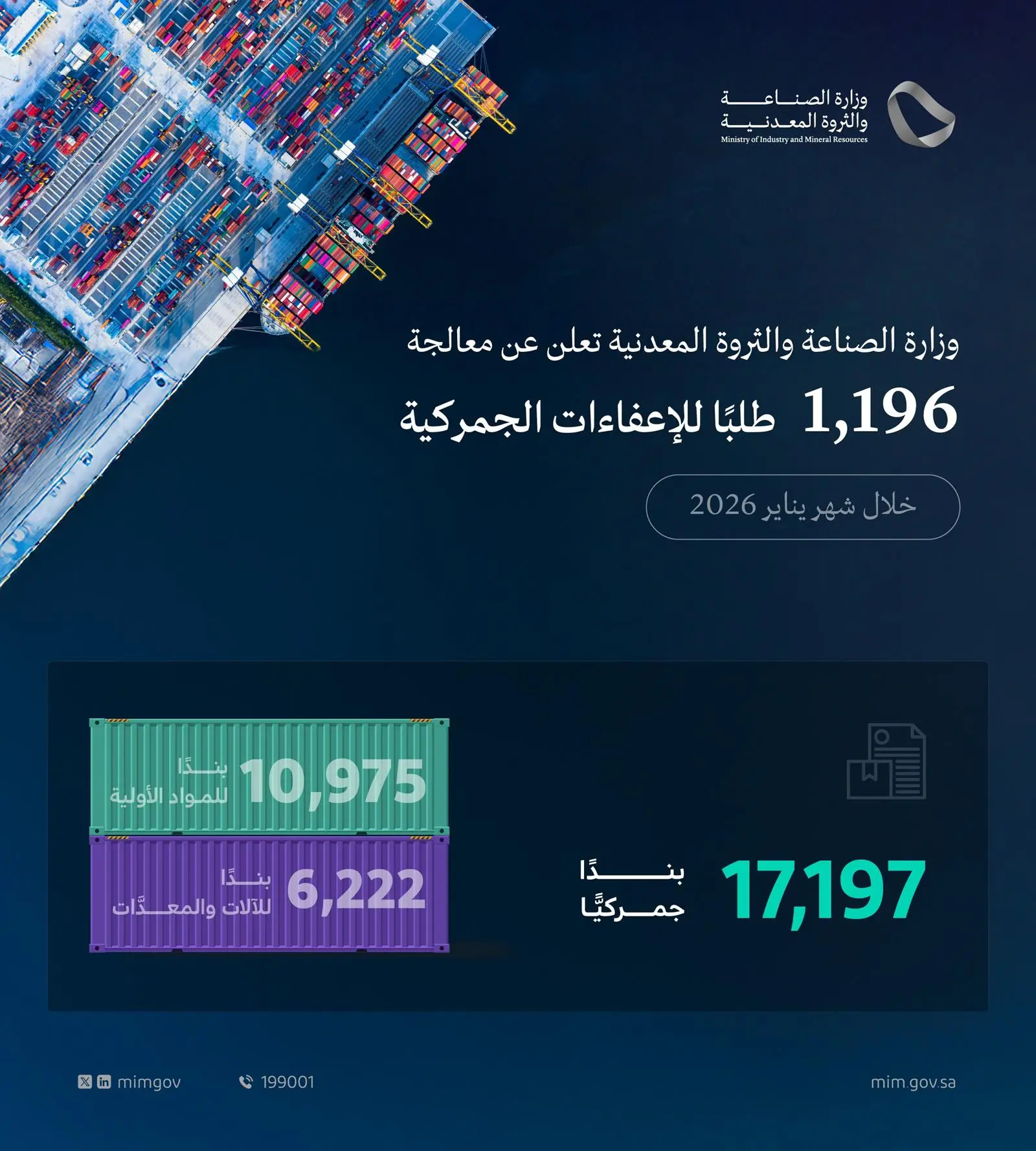 عالجت وزارة الصناعة والثروة المعدنية 1,196 طلبًا لخدمة الإعفاء الجمركي الصناعي خلال شهر يناير 2026م، في إطار جهود الوزارة لتشجيع الصناعة المحلية وتعزيز تنافسيتها عالميًا، عبر منح المنشآت الصناعية الوطنية إعفاءً من الرسوم الجمركية على وارداتها من مدخلات الصناعة.