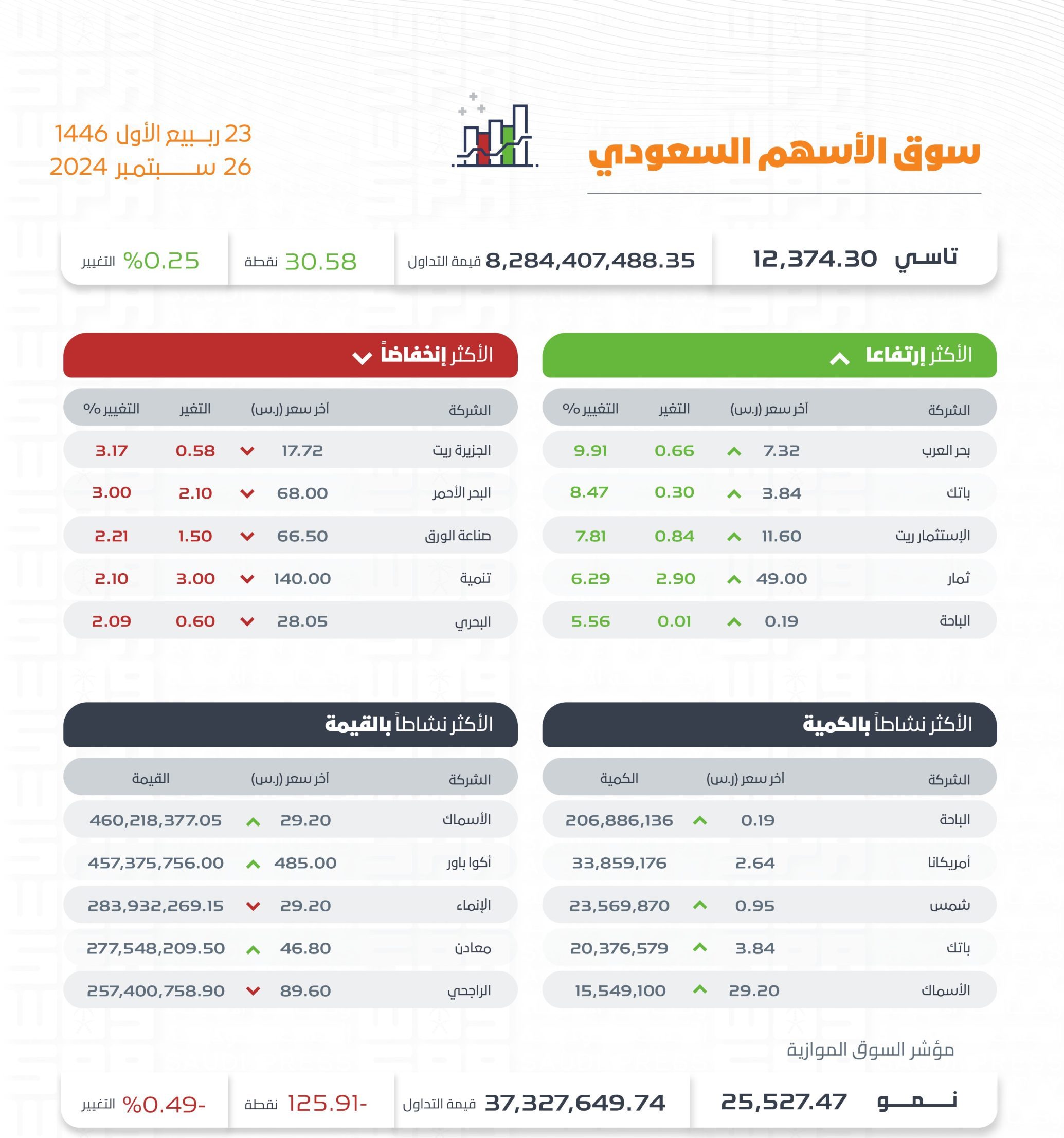 صراحة – واس : أغلق مؤشر الأسهم السعودية الرئيس اليوم مرتفعًا 30.58 نقطة ليقفل عند مستوى 12374.30 نقطة, وبتداولات بلغت قيمتها 8.2 مليارات ريال.