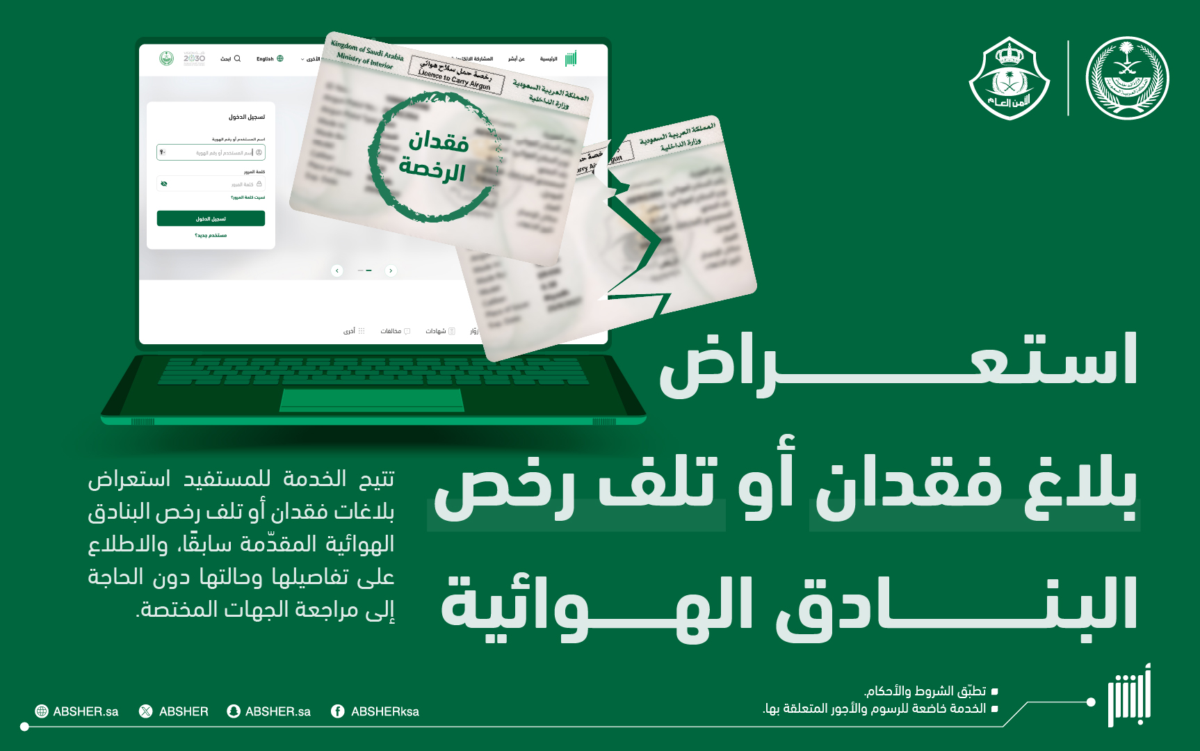 “أبشر” تتيح استعراض بلاغات فقدان أو تلف رخص البنادق الهوائية إلكترونيًا