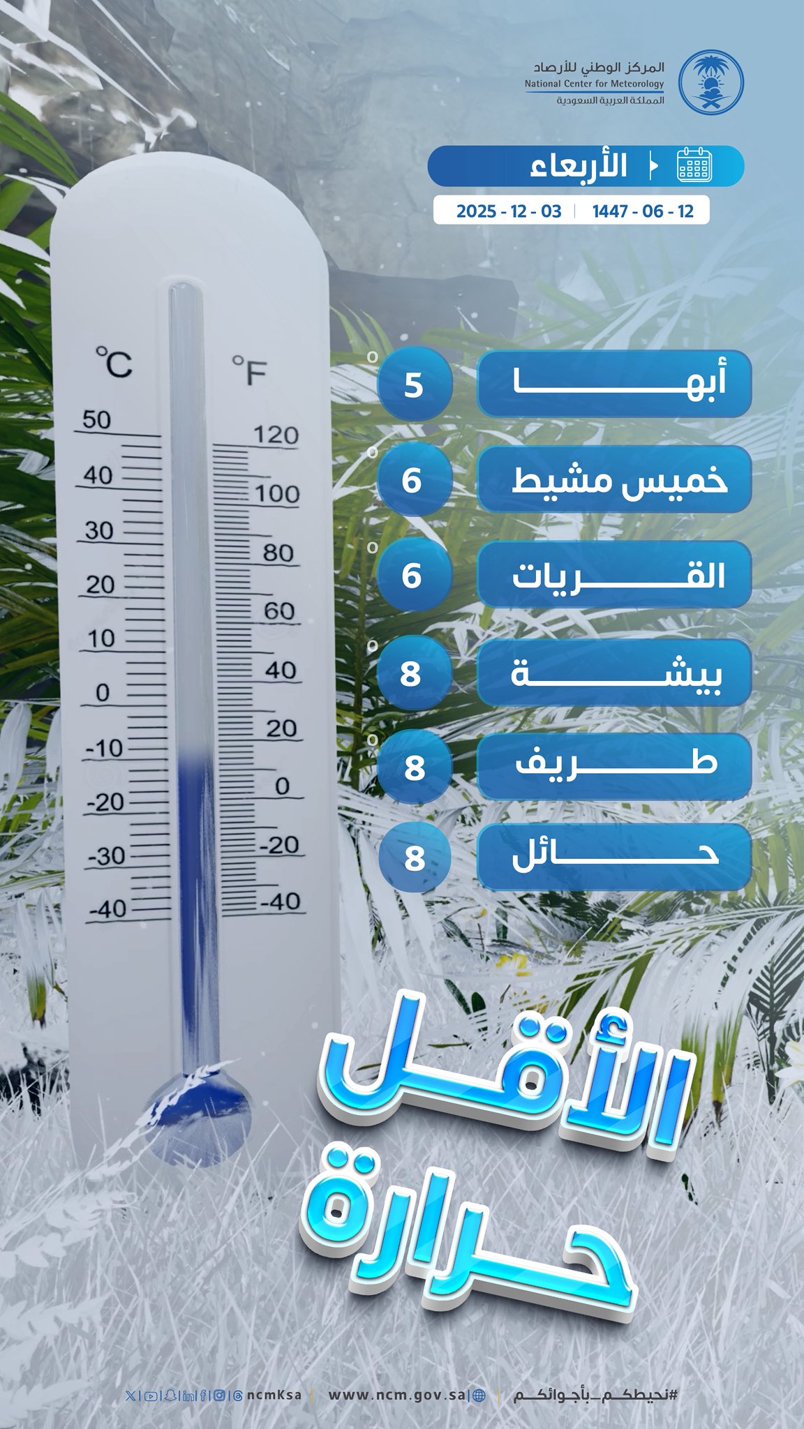 كما أشار المركز إلى تسجيل 8 درجات مئوية في كل من بيشة وطريف وحائل.