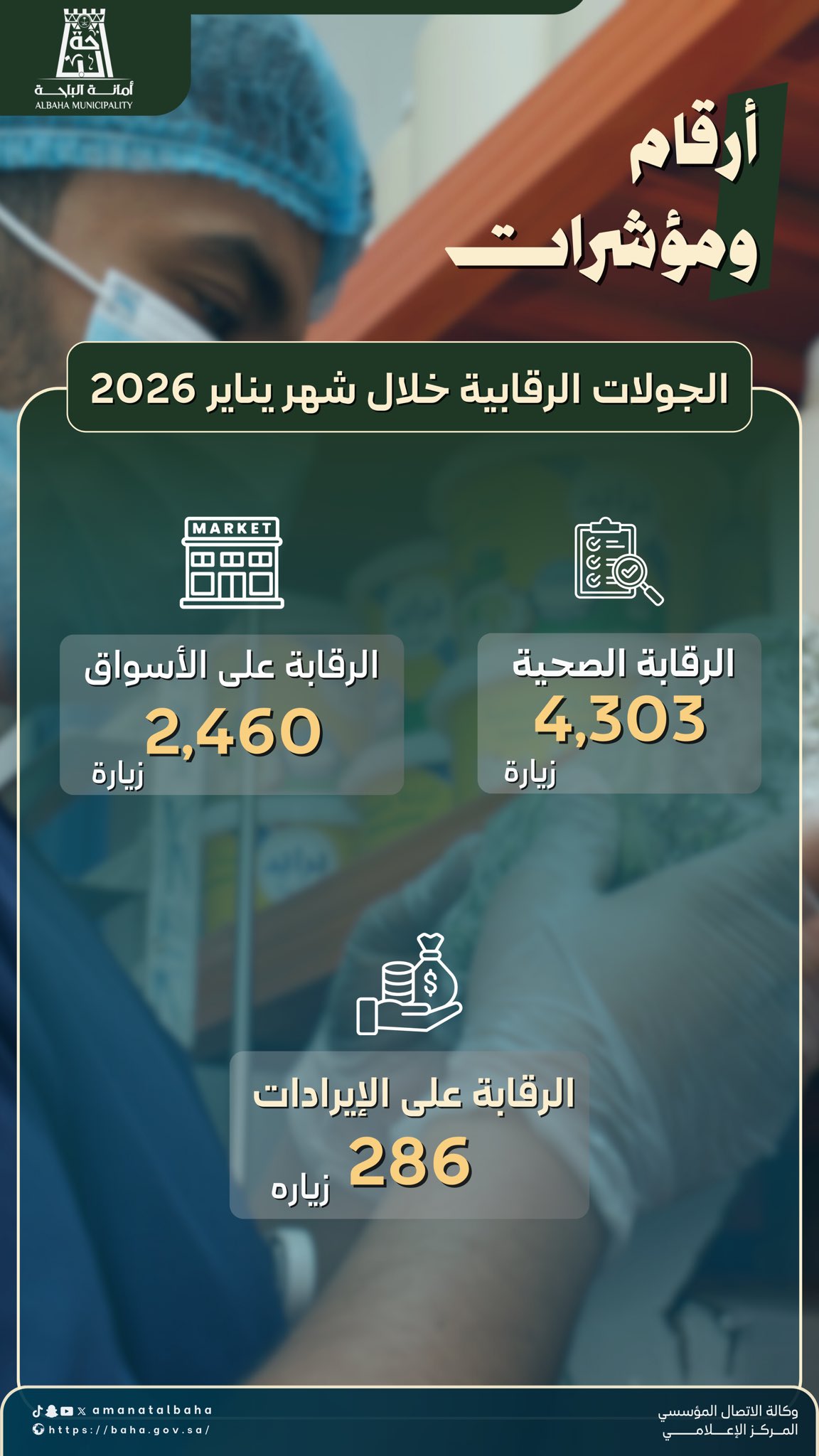 نفَّذت أمانة منطقة الباحة خلال شهر يناير 2026 جولاتٍ رقابية مكثفة شملت عددًا من الأنشطة التجارية والخدمية، وذلك ضمن جهودها المستمرة لتعزيز الامتثال للاشتراطات البلدية والصحية، ورفع مستوى السلامة العامة، وجودة الخدمات المقدمة للمستفيدين.
