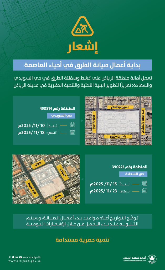 كما ستبدأ الأعمال في حي السعادة (المنطقة رقم 390225) خلال الفترة من 15 إلى 23 نوفمبر 2025م، حيث ستشمل كشط وإعادة سفلتة عدد من الطرق الحيوية في الحي.