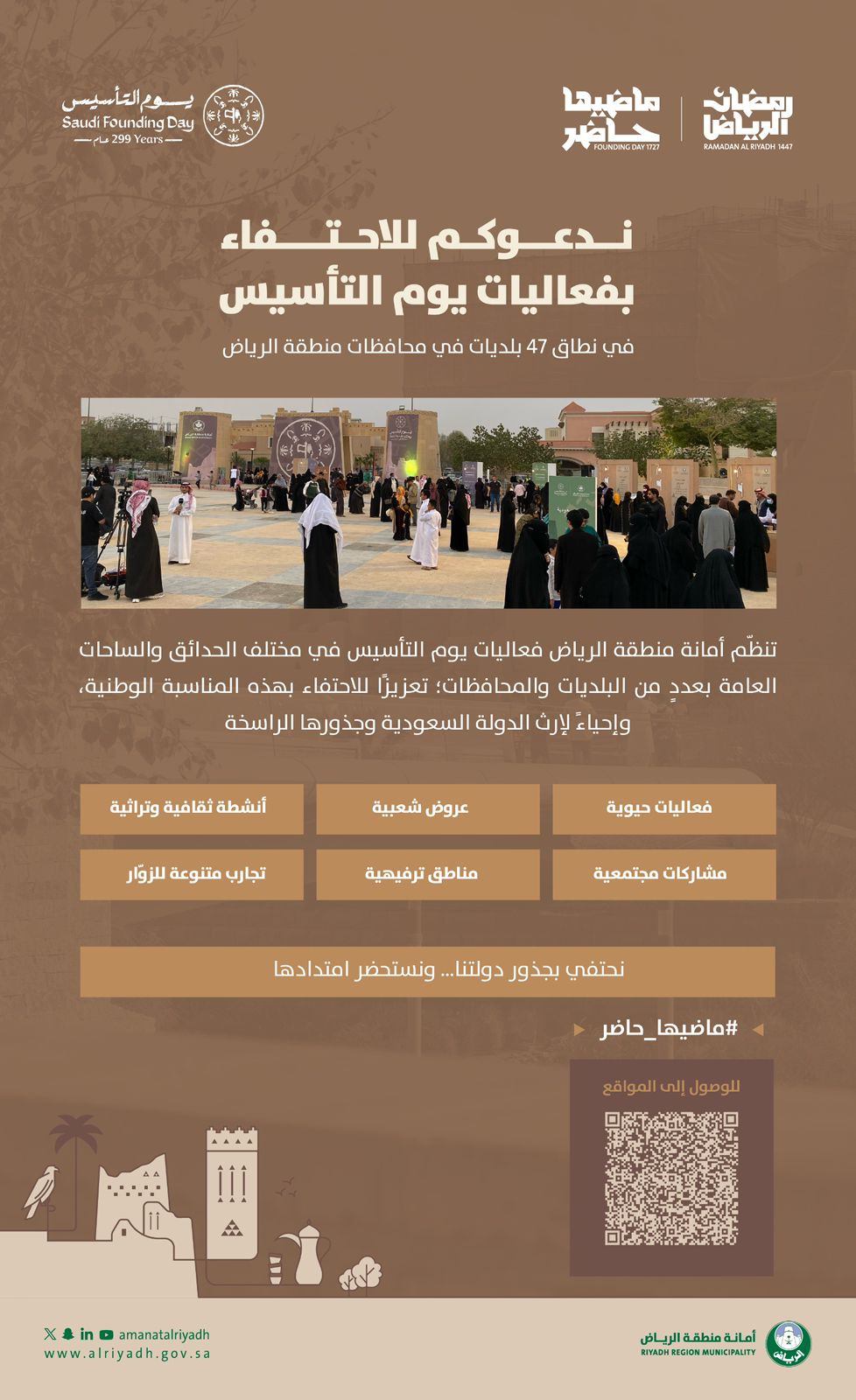 وتستضيف امانة الرياض، ممثلة ببلدياتها التابعة في المحافظات والمراكز ضمن نطاق المنطقة، الزوار في قرابة 50 موقعاً مجهزة بمختلف العروض من الفعاليات في الحدائق والمنتزهات العامة، أنشطة متنوعة، بطابع احتفالي من خلال العروض التي يقدمها مسرح التأسيس، إلى جانب مناطق الضيافة تقدم التمور والقهوة السعودية ضمن هوية مصممة ليوم التأسيس، بما يجسد كرم الضيافة السعودية ضمن تنسيق بصري موحد.