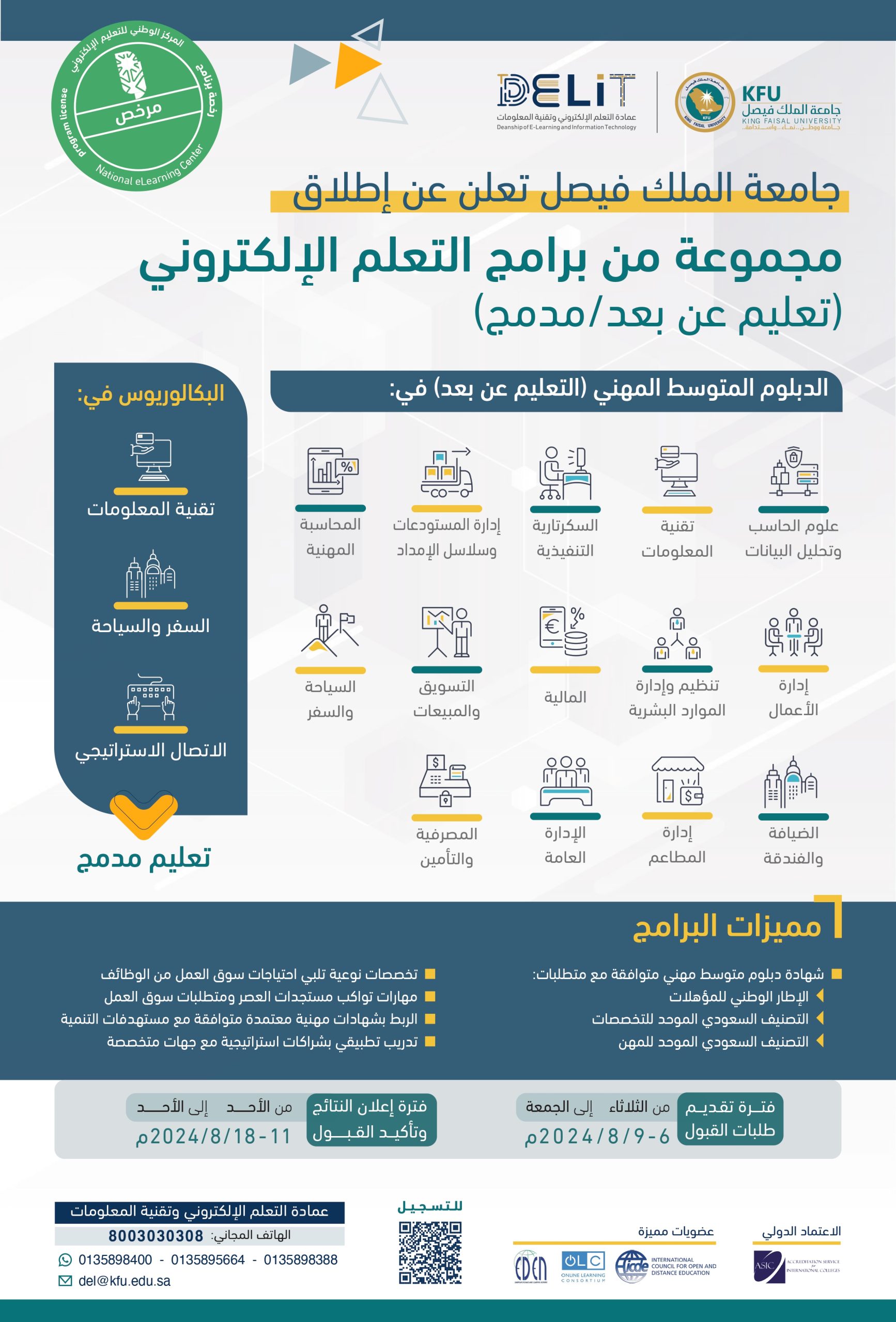 صراحة – الرياض :  اعلنت جامعة الملك فيصل تعلن عن فتح بوابة القبول في عدد من البرامج المتخصصة المقدمة بنمط ⁧التعلم الالكتروني والتعليم عن بعد وفق أعلى المعايير المهنية وبخبرة تتجاوز 15 عاماً في مجال التعلم الالكتروني والتعليم عن بعد وبمنظومة متكاملة من التقنيات التعليمية المتطورة.