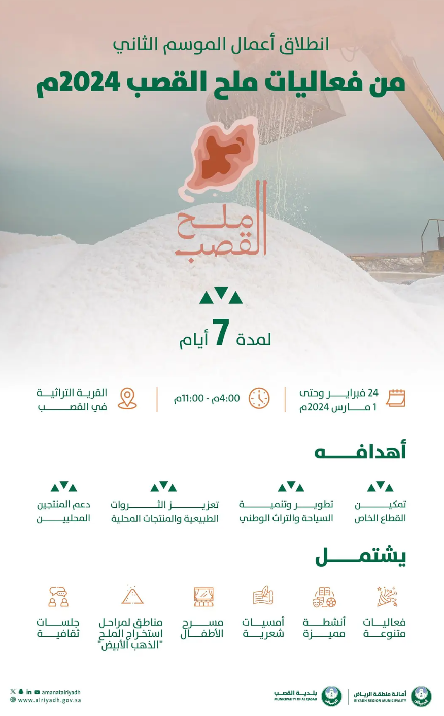 ويتضمن الموسم جملة من الفعاليات والأنشطة المميزة التي تسهم في تعريف الزوّار بملح القصب الذي يُسمى بـ “الذهب الأبيض” ورحلة استخراجه وإنتاجه وتصديره، فضلًا عن تمكين القطاع الخاص، وتطوير وتنمية القطاع السياحي والتراث الوطني.
