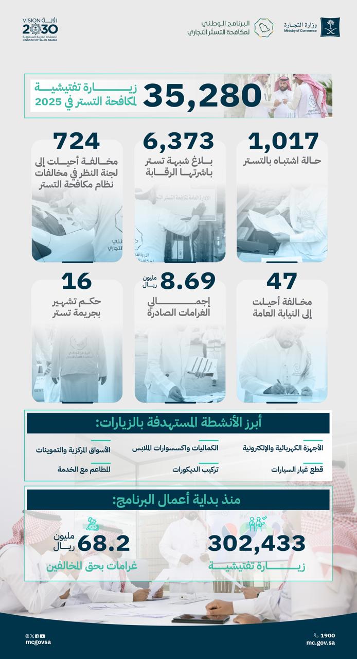 نفذ البرنامج الوطني لمكافحة التستر التجاري 35,280 زيارة تفتيشية بكافة مناطق المملكة خلال العام 2025م، استناداً إلى الدلالات ومؤشرات الاشتباه بالتستر.