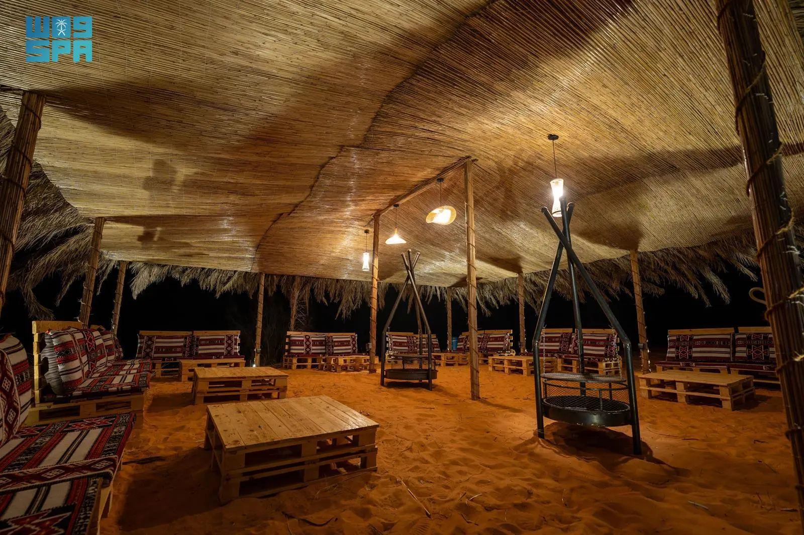 ويُقدّم المخيم تجربة مبيت متكاملة توفر تجهيزات فندقية كاملة داخل الوحدات، وتتيح الجلسات الخارجية فرصة للاستمتاع بتفاصيل المكان والاقتراب من التجارب المرتبطة به مثل: ركوب الإبل، ومسارات المشي التي تُعرّف الزائر بعمق المنطقة وتفاصيلها الطبيعية، كما تأتي تجربة (السماء المعتمة)؛ لتمنح الزائر فرصة فريدة لمراقبة الكواكب والنجوم في بيئة مفتوحة ونقية.