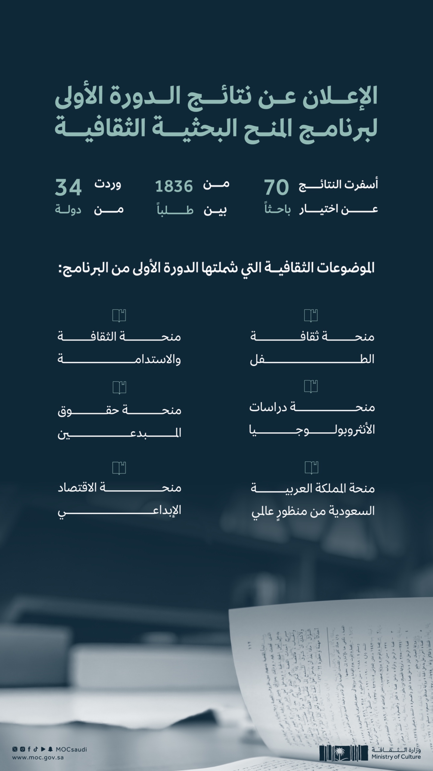 أعلنت وزارة الثقافة اليوم، نتائج الدورة الأولى لبرنامج المنح البحثية الثقافية، وذلك في ستة موضوعاتٍ ثقافية حددتها الوزارة وفق الأولويات البحثية، وهي: منحة دراسات الأنثروبولوجيا، ومنحة المملكة العربية السعودية من منظورٍ عالمي، ومنحة ثقافة الطفل، ومنحة الاقتصاد الإبداعي، ومنحة الثقافة والاستدامة، وأخيرًا منحة حقوق المبدعين.