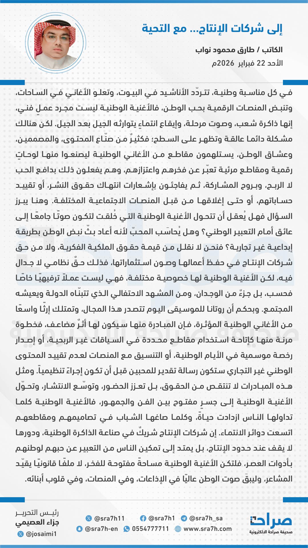 في كل مناسبة وطنية، تتردّد الأناشيد في البيوت، وتعلو الأغاني في الساحات، وتنبض المنصات الرقمية بحب الوطن، فالأغنية الوطنية ليست مجرد عملٍ فني، إنها ذاكرة شعب، وصوت مرحلة، وإيقاع انتماءٍ يتوارثه الجيل بعد الجيل. لكن هنالك مشكلة دائما عالقة وتظهر على السطح؛ فكثيرٌ من صنّاع المحتوى، والمصممين، وعشاق الوطن، يستلهمون مقاطع من الأغاني الوطنية ليصنعوا منها لوحاتٍ رقمية ومقاطع مرئية تعبّر عن فخرهم واعتزازهم، وهم يفعلون ذلك بدافع الحب لا الربح، وبروح المشاركة، ثم يفاجئون بإشعارات انتهاك حقوق النشر، أو تقييد حساباتهم، أو حتى إغلاقها من قبل المنصات الاجتماعية المختلفة. وهنا يبرز السؤال فهل يُعقل أن تتحول الأغنية الوطنية التي خُلقت لتكون صوتًا جامعًا إلى عائق أمام التعبير الوطني؟ وهل يُحاسَب المحبّ لأنه أعاد بثّ نبض الوطن بطريقة إبداعية غير تجارية؟ فنحن لا نقلل من قيمة حقوق الملكية الفكرية، ولا من حق شركات الإنتاج في حفظ أعمالها وصون استثماراتها، فذلك حقٌ نظامي لا جدال فيه، لكن الأغنية الوطنية لها خصوصية مختلفة، فهي ليست عملاً ترفيهيًا خاصًا فحسب، بل جزءٌ من الوجدان، ومن المشهد الاحتفالي الذي تتبنّاه الدولة ويعيشه المجتمع. وبحكم أن روتانا للموسيقى اليوم تتصدر هذا المجال، وتمتلك إرثًا واسعًا من الأغاني الوطنية المؤثرة، فإن المبادرة منها سيكون لها أثرٌ مضاعف، فخطوة مرنة منها كإتاحة استخدام مقاطع محددة في السياقات غير الربحية، أو إصدار رخصة موسمية في الأيام الوطنية، أو التنسيق مع المنصات لعدم تقييد المحتوى الوطني غير التجاري ستكون رسالة تقدير للمحبين قبل أن تكون إجراءً تنظيمياً. ومثل هذه المبادرات لا تنتقص من الحقوق، بل تعزز الحضور، وتوسّع الانتشار، وتحوّل الأغنية الوطنية إلى جسرٍ مفتوح بين الفن والجمهور، فالأغنية الوطنية كلما تداولها الناس ازدادت حياةً، وكلما صاغها الشباب في تصاميمهم ومقاطعهم اتسعت دوائر الانتماء. إن شركات الإنتاج شريكٌ في صناعة الذاكرة الوطنية، ودورها لا يقف عند حدود الإنتاج، بل يمتد إلى تمكين الناس من التعبير عن حبهم لوطنهم بأدوات العصر، فلتكن الأغنية الوطنية مساحةً مفتوحة للفخر، لا ملفًا قانونيًا يقيّد المشاعر، وليبقَ صوت الوطن عاليًا في الإذاعات، وفي المنصات، وفي قلوب أبنائه.