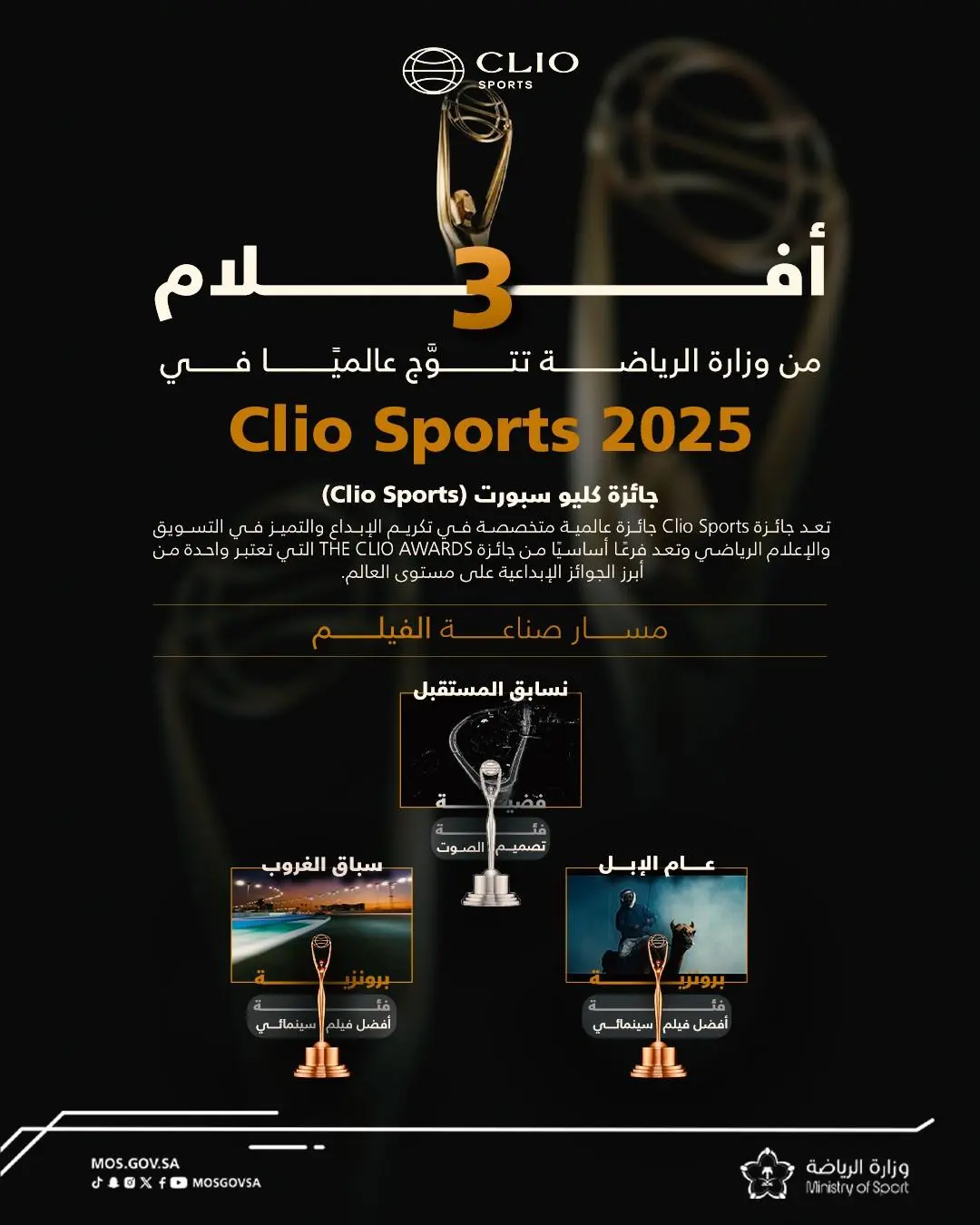 يُذكر أن Clio Sports تُعد إحدى أهم الجوائز العالمية المتخصصة في تكريم الإبداع في مجالات التسويق والإعلام الرياضي، وتندرج ضمن منظومة Clio Awards.