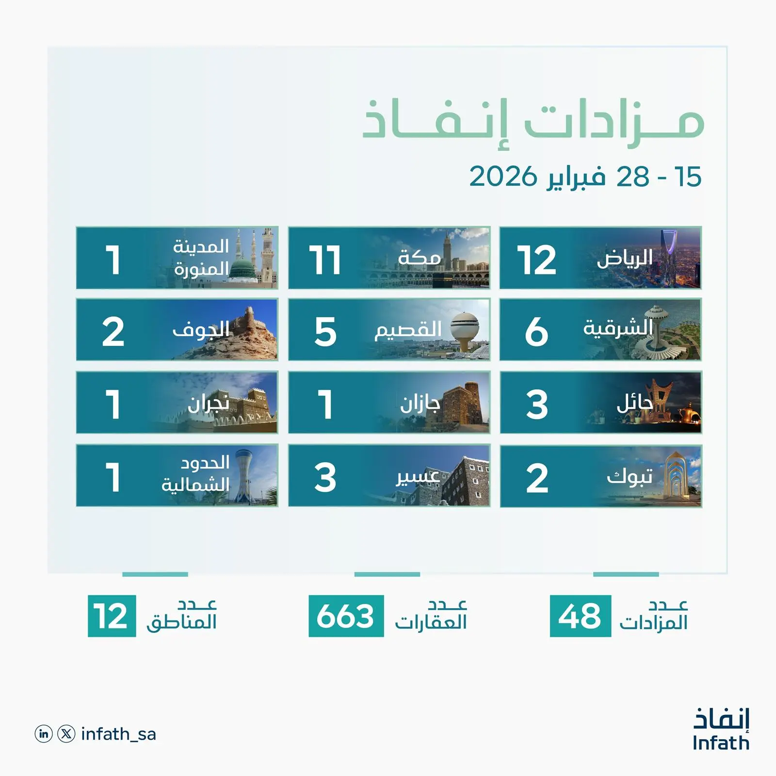 يشرف مركز الإسناد والتصفية (إنفاذ) على إقامة 48 مزادًا عقاريًا خلال الفترة من 15 حتى 31 يناير 2026، لبيع 663 أصلًا عقاريًا متنوعًا تشمل العقارات السكنية والتجارية والزراعية في مختلف مناطق المملكة.