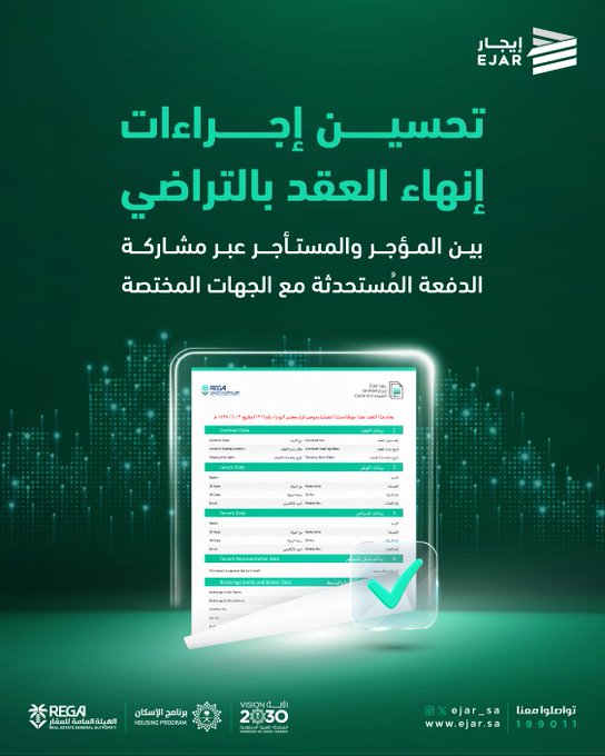 أعلنت منصة إيجار اليوم عن استحداث خاصية تقنية جديدة تتمثل في عكس فاتورة التسوية بعد إنهاء العقد الإيجاري بالتراضي، وذلك ضمن جهودها المستمرة لتطوير الخدمات الرقمية وتسهيل الإجراءات على المستفيدين.