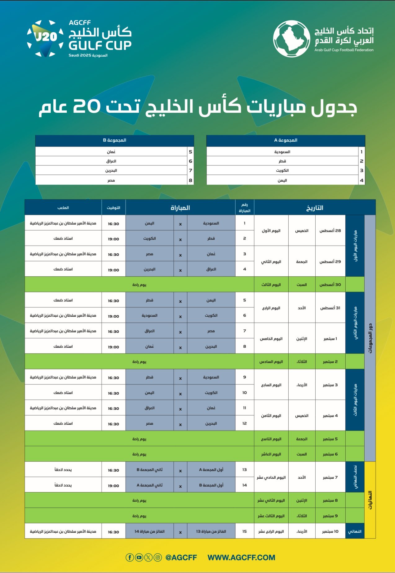 صراحة – أبها : اعتمد اتحاد كأس الخليج العربي لكرة القدم، جدول مباريات وملاعب بطولة كأس الخليج للمنتخبات تحت 20 عامًا، التي تستضيفها المملكة العربية السعودية في مدينة أبها خلال الفترة من 28 أغسطس وحتى 10 سبتمبر 2025.