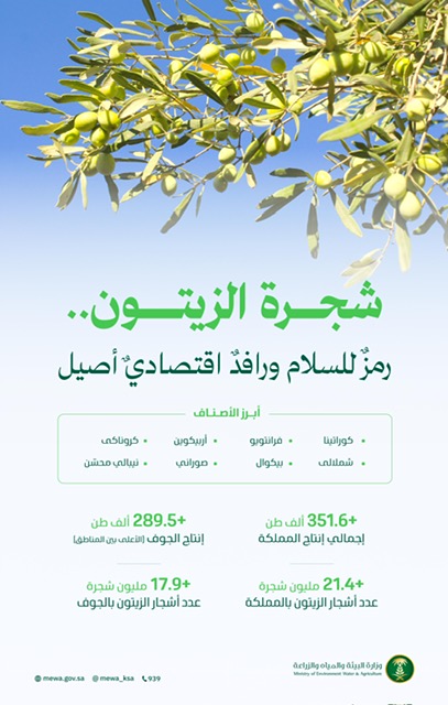 وأشارت الوزارة، إلى أن زراعة الزيتون في المملكة، تتميز ببعض الخصائص، من أبرزها تحقيق مبدأ كفاءة استخدام المياه، والإدارة الفعّالة للأراضي، إضافةً إلى التوسع المنظّم في المساحات الزراعية القائمة على أساليب الإنتاج الحديثة والمكثفة، كما يُمثّل الزيتون ركيزة أساسية للتغذية الصحية؛ إذ يتميز زيت الزيتون، وزيتون المائدة بفوائد غذائية، وخصائص علاجية تُسهم في الوقاية من عدة أمراض، مبينة أن هناك أصناف عديدة ومتنوعة من الزيتون تتم زراعتها في مختلف مناطق المملكة، من أبرزها، كوراتينا، وفرانتويو، وأربيكوين، وكروناكى، وشملالى، وبيكوال، ونيبالي محسّن، وصوراني.