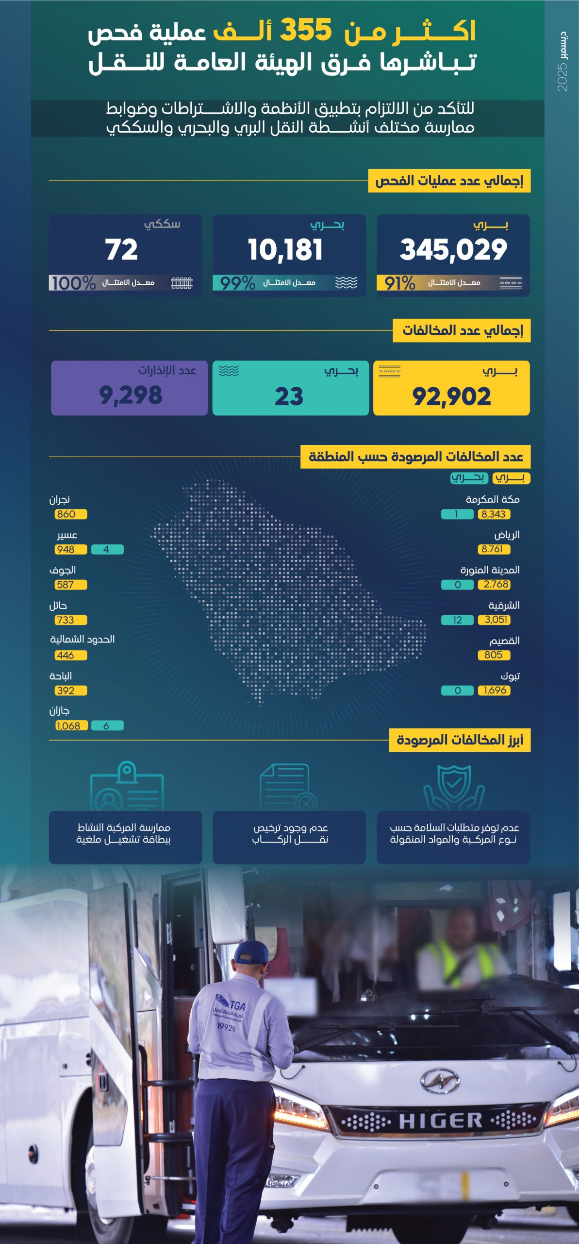 كشفت الهيئة العامة للنقل اليوم، أن عدد عمليات الفحص التي نفذتها الفرق الرقابية التابعة لها في قطاع النقل البري والسككي والبحري في مختلف مناطق المملكة، سجلت ارتفاعًا ملحوظًا بلغ أكثر من (355) ألف عملية فحص خلال شهر ديسمبر 2025، مقارنة بـ(345) ألف عملية فحص في شهر نوفمبر من العام ذاته، مما يعكس حرص الهيئة على تعزيز مستوى الامتثال والتأكد من التزام جميع الأفراد والمنشآت المرخصة بالأنظمة.