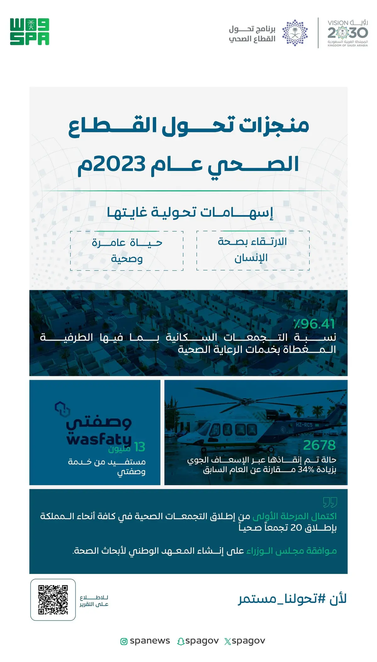 وشهدت منجزات التحول لعام 2023م موافقات وإطلاقات عدة؛ تسهم في تعزيز قدرات القطاع، وترسم ملامحه المستقبلية، تضمنت موافقة مجلس الوزراء على إنشاء المعهد الوطني لأبحاث الصحة، واكتمال مجموعة من المراحل والمبادرات فقد اكتملت المرحلة الأولى من مبادرة التحول المؤسسي لوزارة الصحة بإطلاق جميع التجمعات الصحية لتقوم بدورها كتجمعات صحية مسؤولة عن صحة السكان، وتدشين منصة “نفيس” على هامش ملتقى الصحة العالمي وغيرها من الإطلاقات والمبادرات.