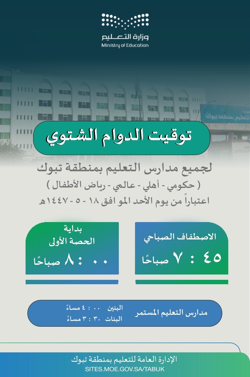 اعتمدت الإدارة العامة للتعليم بمنطقة تبوك العمل بتوقيت الدوام الشتوي في جميع مدارس المنطقة، ابتداءً من يوم الأحد الموافق 18 / 5 / 1447هـ، وذلك في مدارس التعليم الحكومي والأهلي والعالمي ورياض الأطفال.