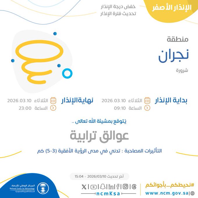 أصدر المركز الوطني للأرصاد تنبيهاً لمحافظة شرورة بمنطقة نجران، حيث تم تحديث فترة الإنذار وخفض درجته إلى اللون الأصفر، نتيجة لتوقعات بنشاط العوالق الترابية التي تؤثر على الحالة الجوية العامة بالمنطقة.