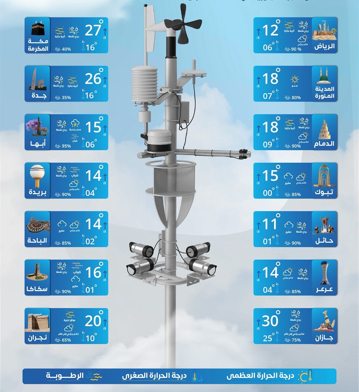 توقّع المركز الوطني للأرصاد في تقريره عن حالة الطقس هذا اليوم -بمشيئة الله-، طقسًا باردًا إلى شديد البرودة على مناطق الحدود الشمالية، الجوف، تبوك، حائل، القصيم، يمتد إلى أجزاء من منطقتي الرياض والمدينة المنورة، كذلك على مرتفعات منطقتي مكة المكرمة، الباحة، كما لا يستبعد تكون الضباب والصقيع خلال الليل وساعات الصباح الباكر على أجزاء من تلك المناطق.