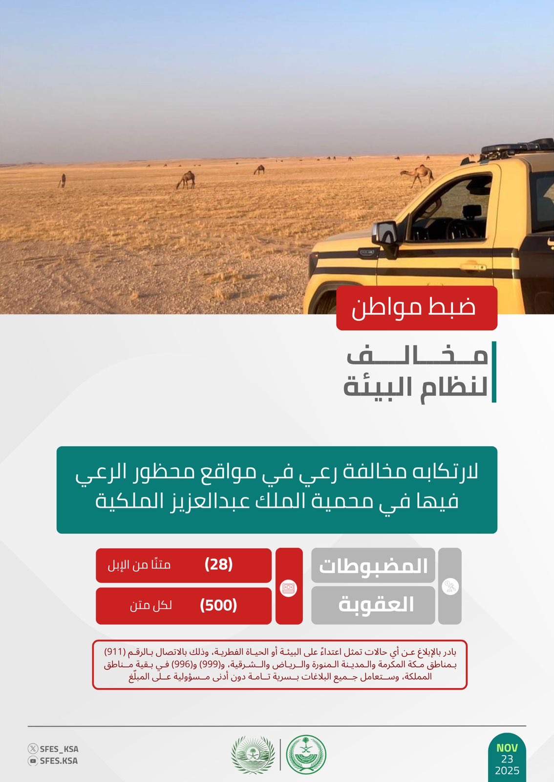 وأكدت القوات أن عقوبة رعي الإبل غرامة (500) ريال لكل متن، حاثةً على الإبلاغ عن أي حالات تمثل اعتداءً على البيئة أو الحياة الفطرية على الرقم (911) بمناطق مكة المكرمة والمدينة المنورة والرياض والشرقية، و(999) و(996) في بقية مناطق المملكة، وستعامل جميع البلاغات بسرية تامة دون أدنى مسؤولية على المبلّغ.