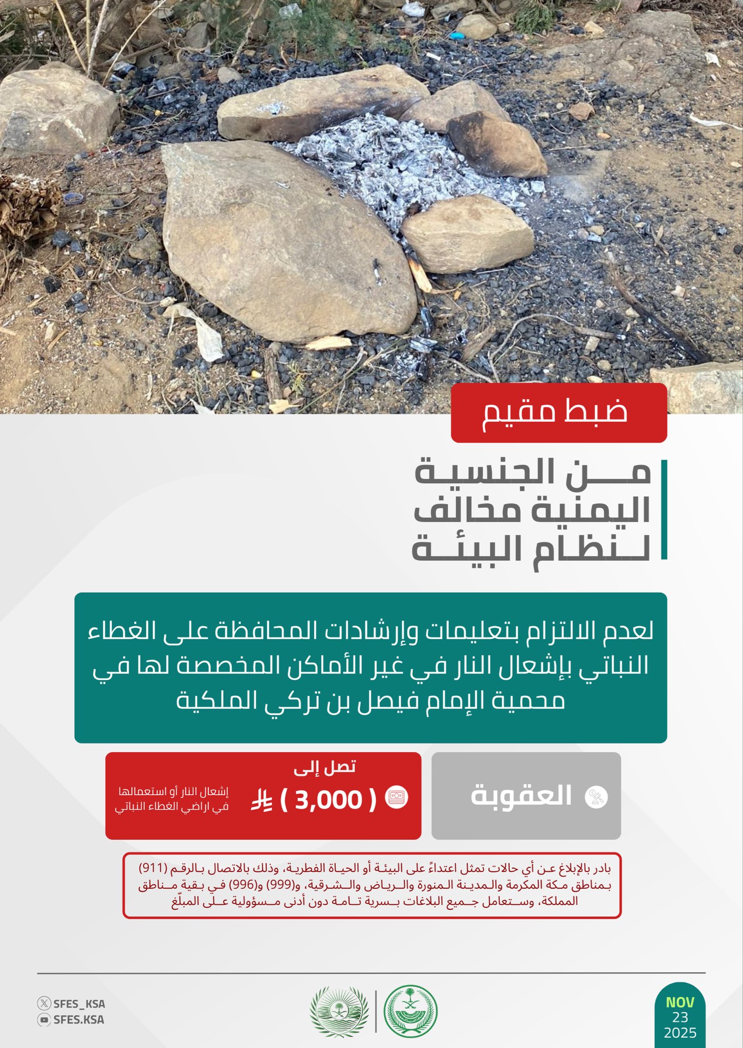 ضبطت القوات الخاصة للأمن البيئي مقيمًا من الجنسية اليمنية مخالفًا لنظام البيئة، لعدم الالتزام بتعليمات وإرشادات المحافظة على الغطاء النباتي بإشعال النار في غير الأماكن المخصصة لها في محمية الإمام فيصل بن تركي الملكية، وطبقت الإجراءات النظامية بحقه.