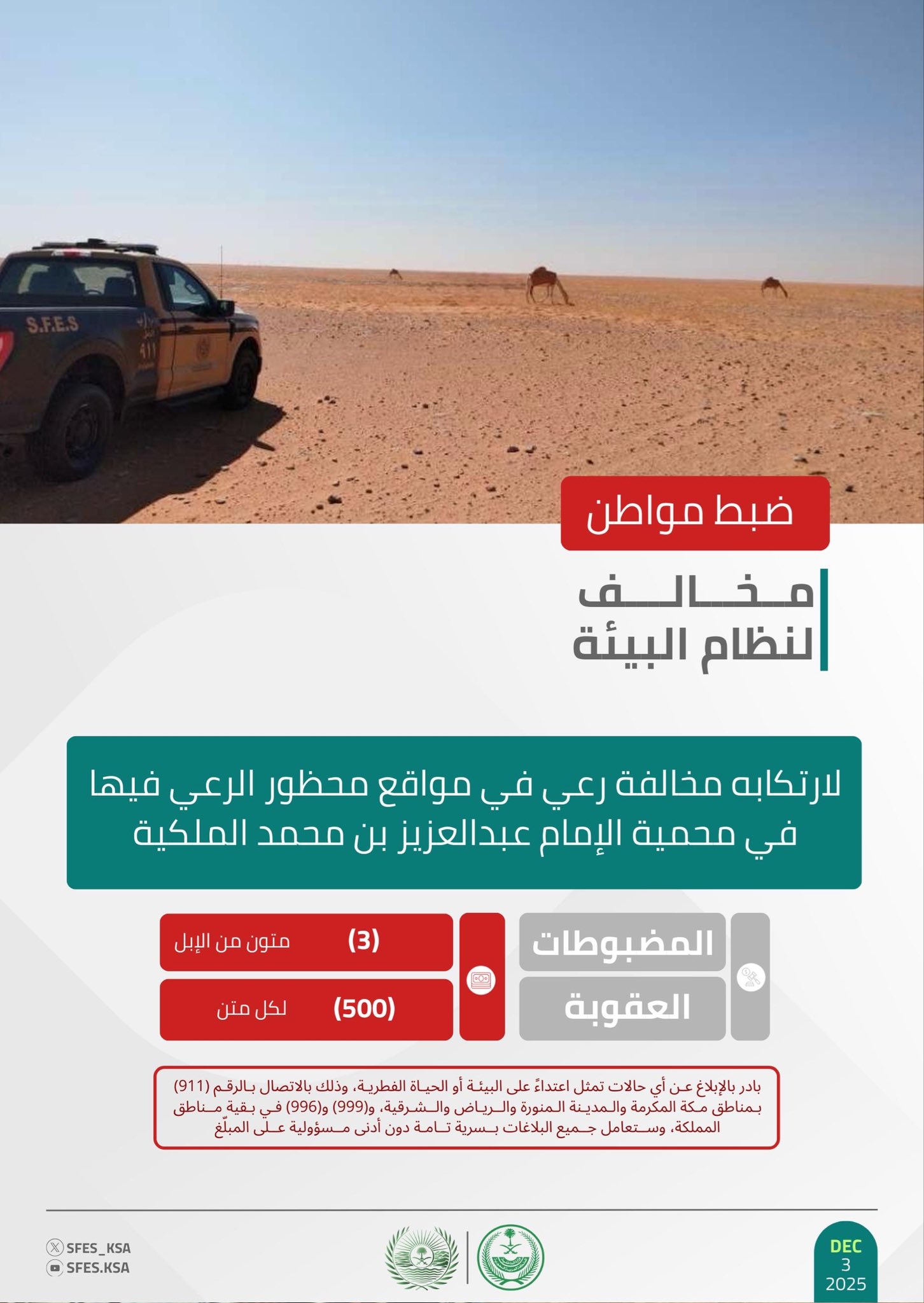 وأكدت القوات أن عقوبة رعي الإبل غرامة (500) ريال لكل متن، حاثةً على الإبلاغ عن أي حالات تمثل اعتداءً على البيئة أو الحياة الفطرية على الرقم (911) بمناطق مكة المكرمة والمدينة المنورة والرياض والشرقية، و(999) و(996) في بقية مناطق المملكة، وستعامل جميع البلاغات بسرية تامة دون أدنى مسؤولية على المبلّغ.