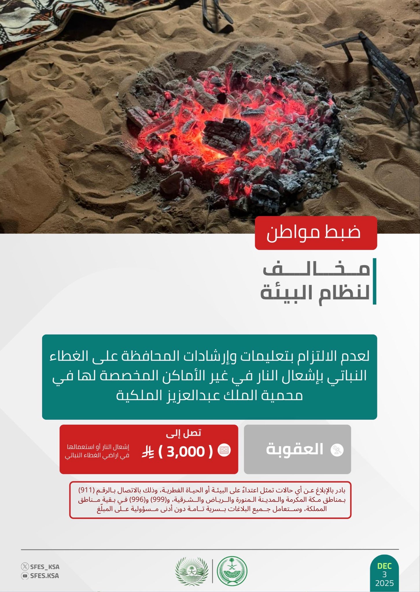 وأكدت القوات أن عقوبة إشعال النار في غير الأماكن المخصصة لها في الغابات والمتنزهات الوطنية غرامة تصل إلى (3,000) ريال، حاثة على الإبلاغ عن أي حالات تمثل اعتداءً على البيئة أو الحياة الفطرية على الرقم (911) بمناطق مكة المكرمة والمدينة المنورة والرياض والشرقية، و(999) و(996) في بقية مناطق المملكة، وستعامل جميع البلاغات بسرية تامة دون أدنى مسؤولية على المبلّغ.
