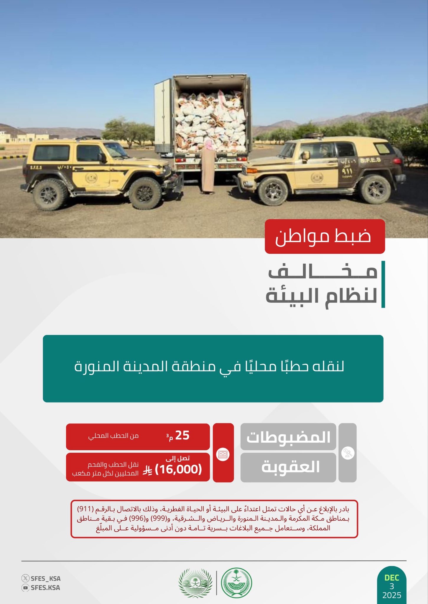 ضبطت القوات الخاصة للأمن البيئي مواطنًا مخالفًا لنظام البيئة، لنقله (25) مترًا مكعبًا من الحطب المحلي في منطقة المدينة المنورة، وطُبقت الإجراءات النظامية بحقه، وتسليم الكميات المضبوطة للجهة المختصة.