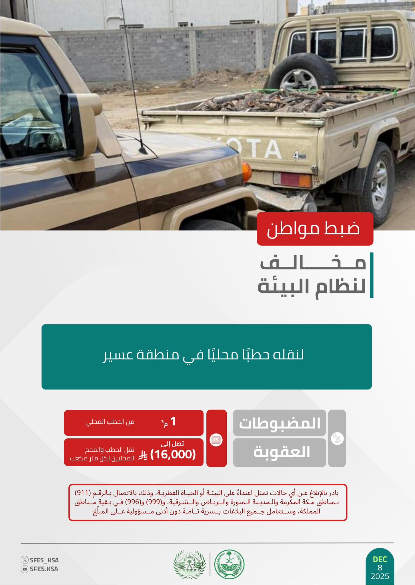 وأوضحت القوات أن عقوبة نقل الحطب والفحم المحليين تصل إلى (16,000) ريال لكل متر مكعب، حاثةً على الإبلاغ عن أي حالات تمثل اعتداءً على البيئة أو الحياة الفطرية على الرقم (911) بمناطق مكة المكرمة والمدينة المنورة والرياض والشرقية، و (999) و (996) في بقية مناطق المملكة، وستعامل جميع البلاغات بسرية تامة دون أدنى مسؤولية على المبلّغ.