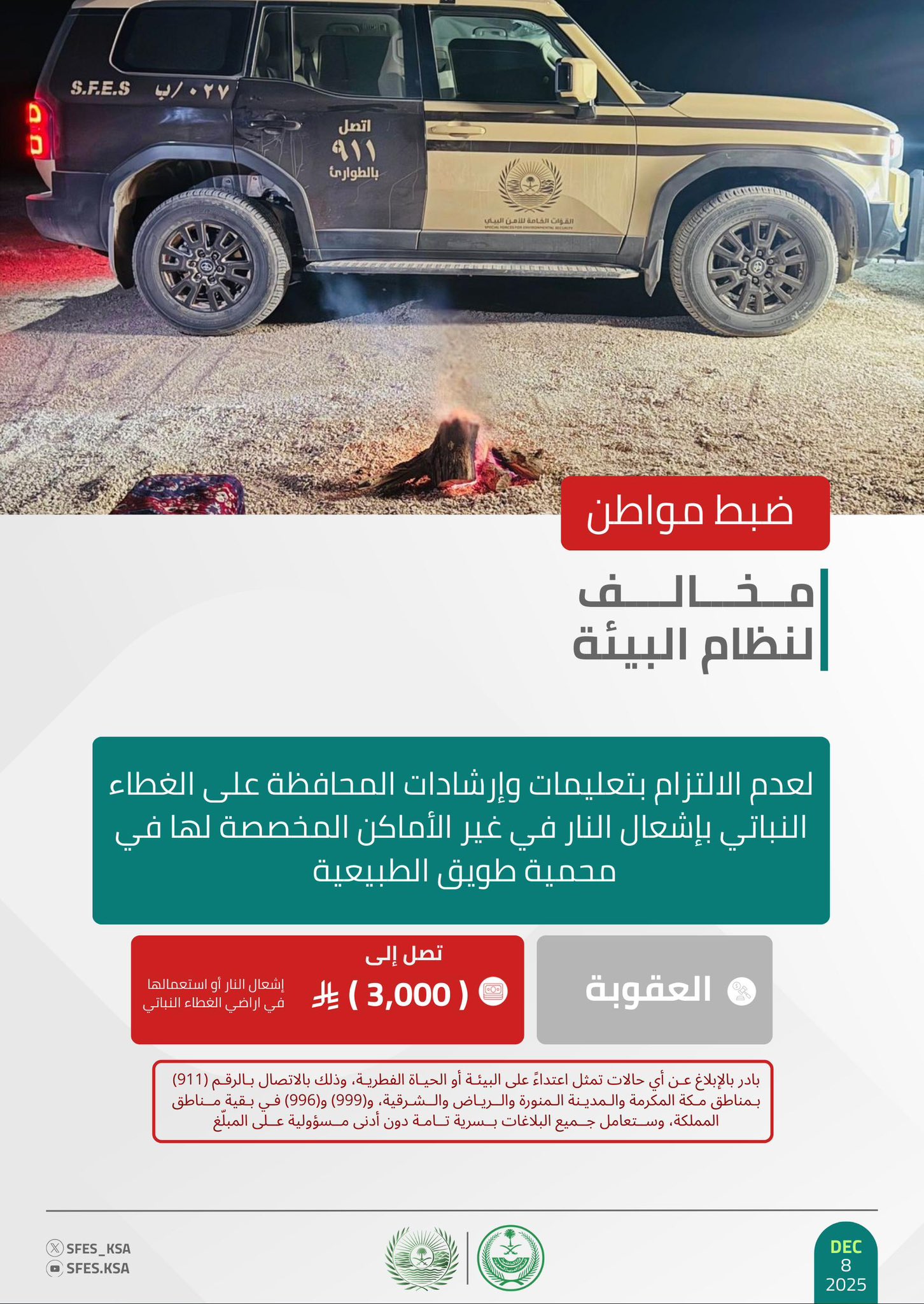 وأكدت القوات أن عقوبة إشعال النار في غير الأماكن المخصصة لها في الغابات والمتنزهات الوطنية غرامة تصل إلى (3,000) ريال، حاثة على الإبلاغ عن أي حالات تمثل اعتداءً على البيئة أو الحياة الفطرية على الرقم (911) بمناطق مكة المكرمة والمدينة المنورة والرياض والشرقية، و(999) و(996) في بقية مناطق المملكة، وستعامل جميع البلاغات بسرية تامة دون أدنى مسؤولية على المبلّغ.