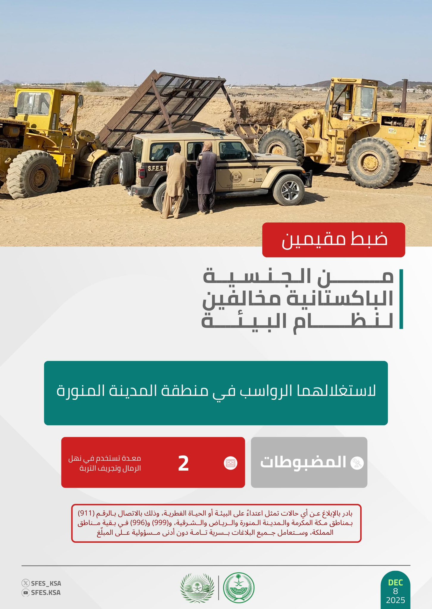 وضبطت القوات الخاصة للأمن البيئي مقيمين مخالفين لنظام البيئة من الجنسية الباكستانية، لاستغلالهما الرواسب في منطقة المدينة المنورة، وطُبقت الإجراءات النظامية بحقهما.