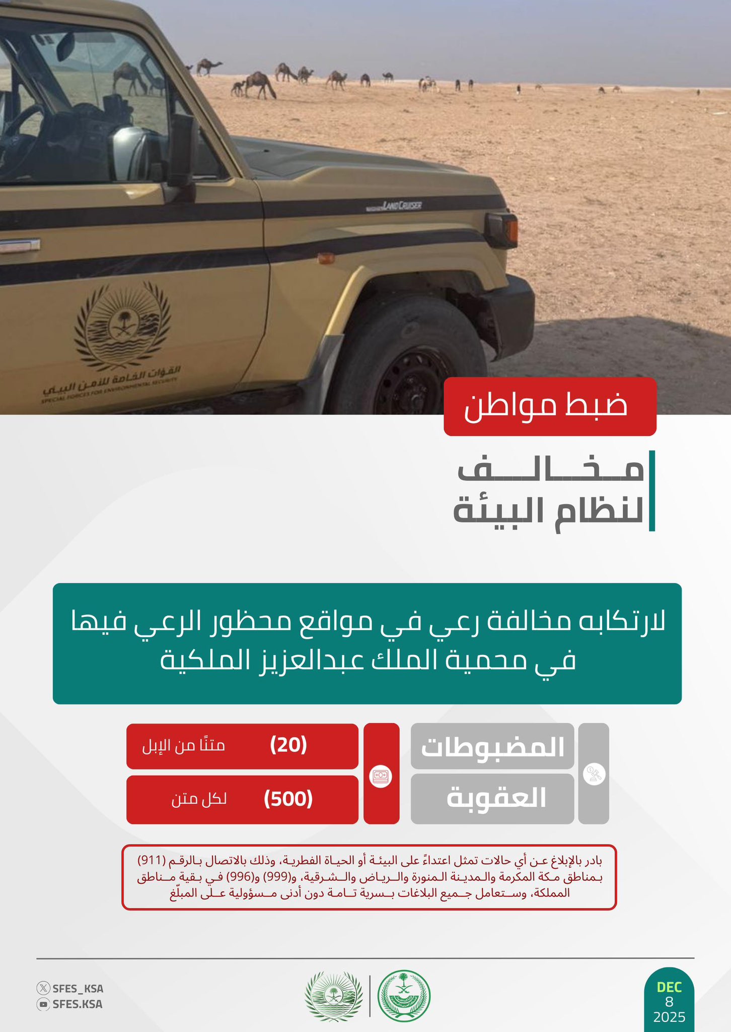 وأكدت القوات أن عقوبة رعي الإبل غرامة (500) ريال لكل متن، حاثةً على الإبلاغ عن أي حالات تمثل اعتداءً على البيئة أو الحياة الفطرية على الرقم (911) بمناطق مكة المكرمة والمدينة المنورة والرياض والشرقية، و(999) و(996) في بقية مناطق المملكة، وستعامل جميع البلاغات بسرية تامة دون أدنى مسؤولية على المبلّغ.