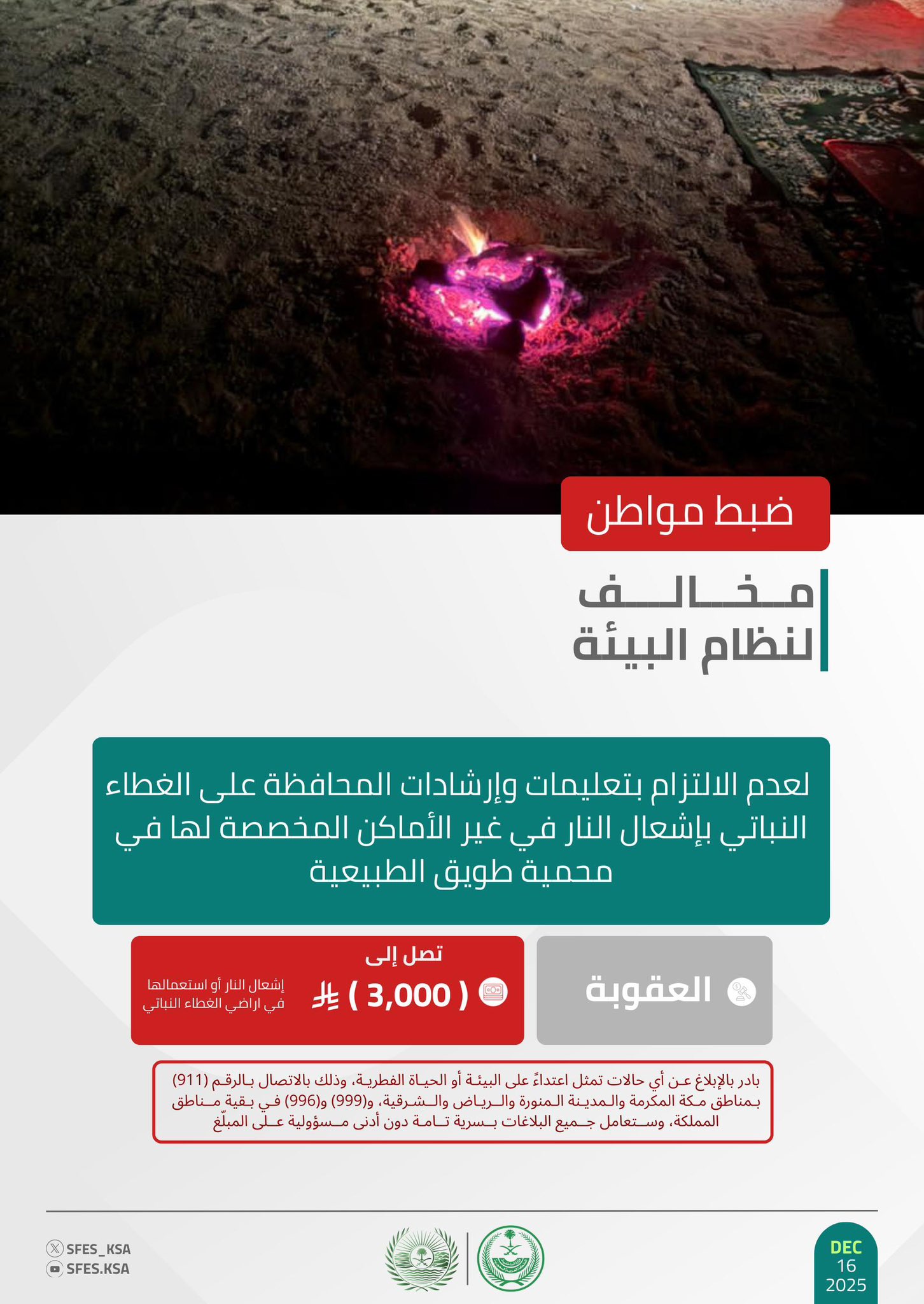 وأكدت القوات أن عقوبة إشعال النار في غير الأماكن المخصصة لها في الغابات والمتنزهات الوطنية غرامة تصل إلى (3,000) ريال، حاثة على الإبلاغ عن أي حالات تمثل اعتداءً على البيئة أو الحياة الفطرية على الرقم (911) بمناطق مكة المكرمة والمدينة المنورة والرياض والشرقية، و(999) و(996) في بقية مناطق المملكة، وستعامل جميع البلاغات بسرية تامة دون أدنى مسؤولية على المبلّغ.