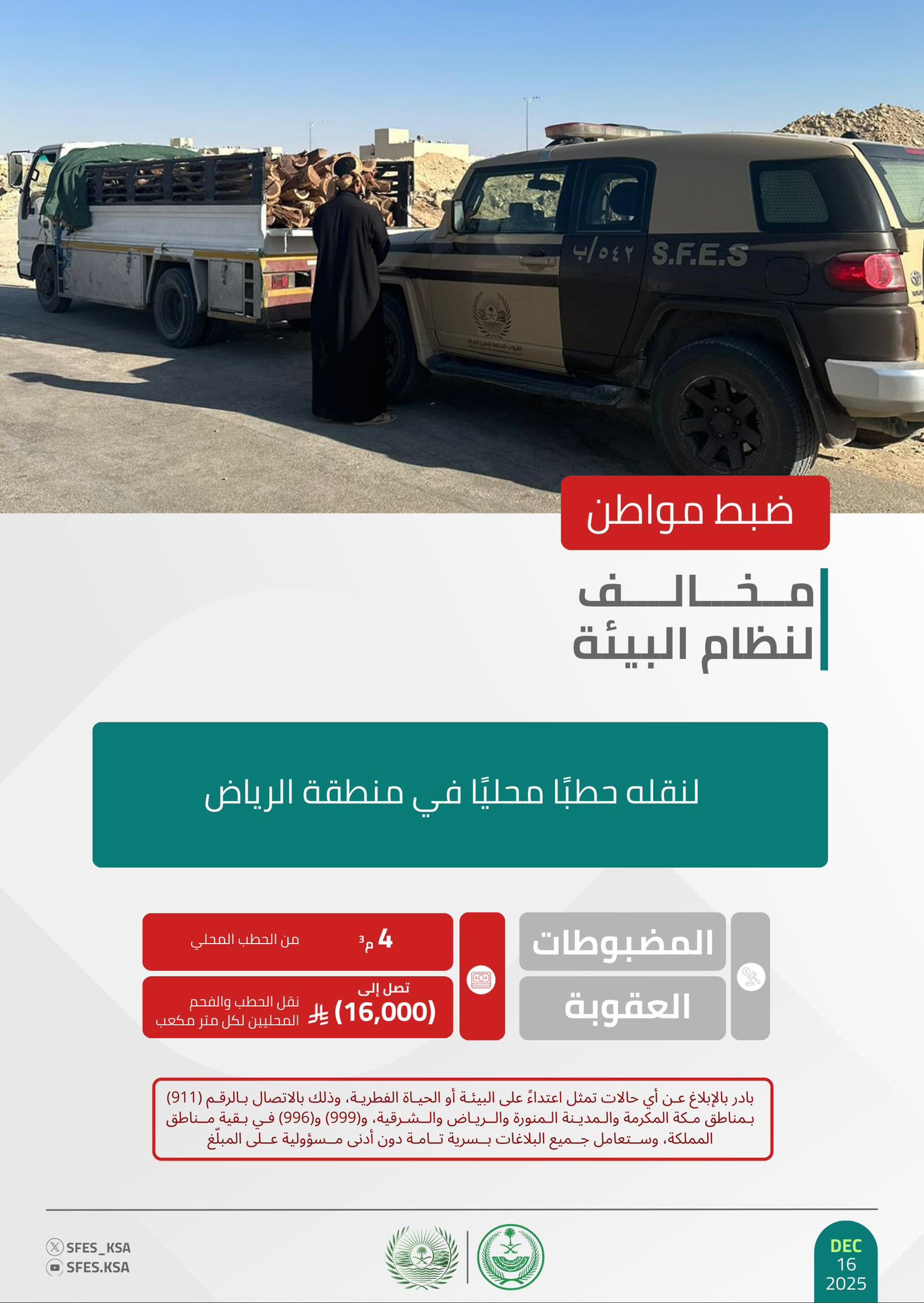 وأوضحت القوات أن عقوبة نقل الحطب والفحم المحليين تصل إلى (16,000) ريال لكل متر مكعب، حاثةً على الإبلاغ عن أي حالات تمثل اعتداءً على البيئة أو الحياة الفطرية على الرقم (911) بمناطق مكة المكرمة والمدينة المنورة والرياض والشرقية، و(999) و(996) في بقية مناطق المملكة، وستعامل جميع البلاغات بسرية تامة دون أدنى مسؤولية على المبلّغ.