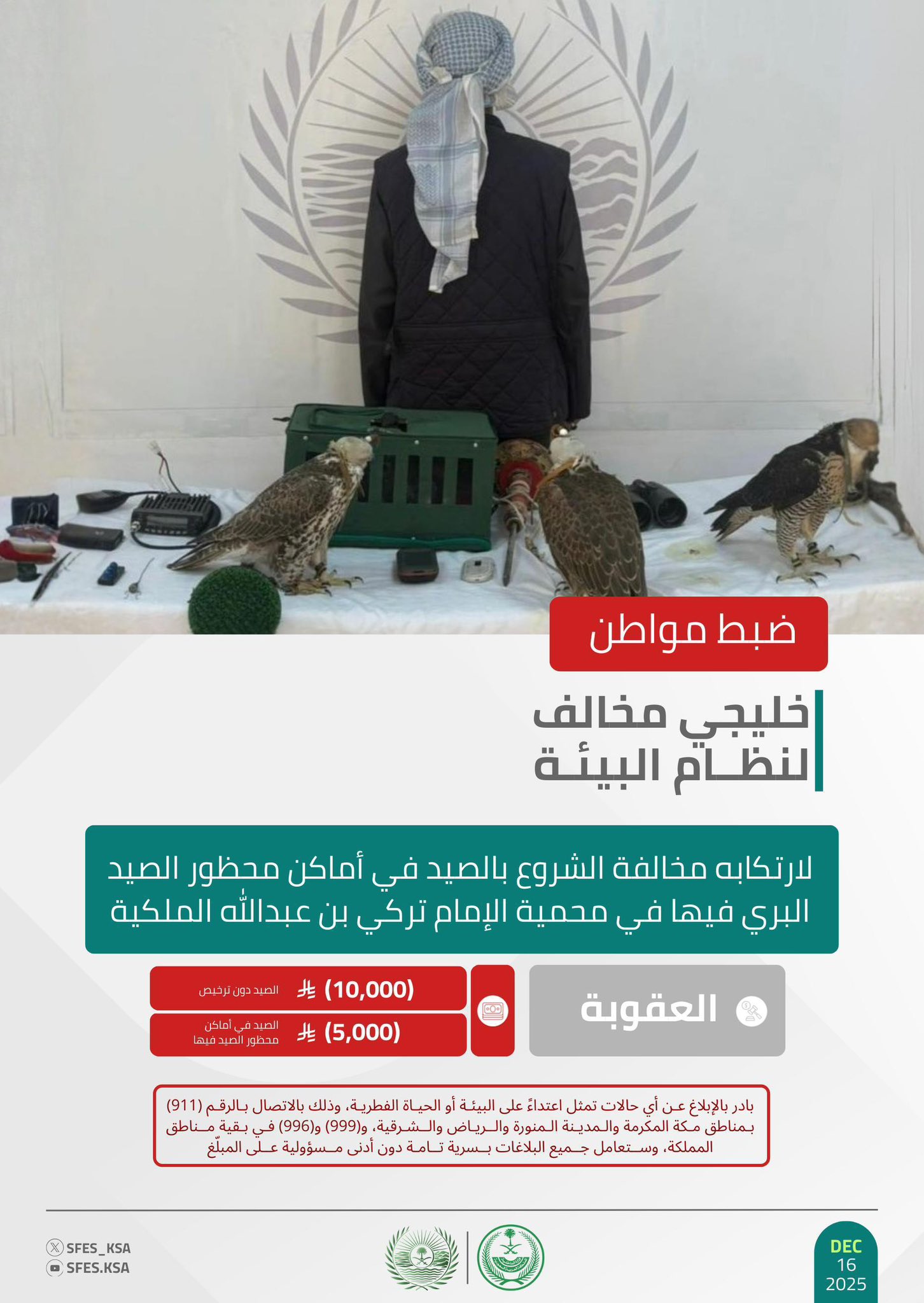 وشددت القوات على الالتزام بنظام البيئة ولوائحه التنفيذية التي تجرم صيد الكائنات الفطرية، مؤكدةً أن عقوبة الصيد في أماكن محظور الصيد البري فيها غرامة (5,000) ريال، وعقوبة الصيد دون ترخيص غرامة (10,000) ريال.