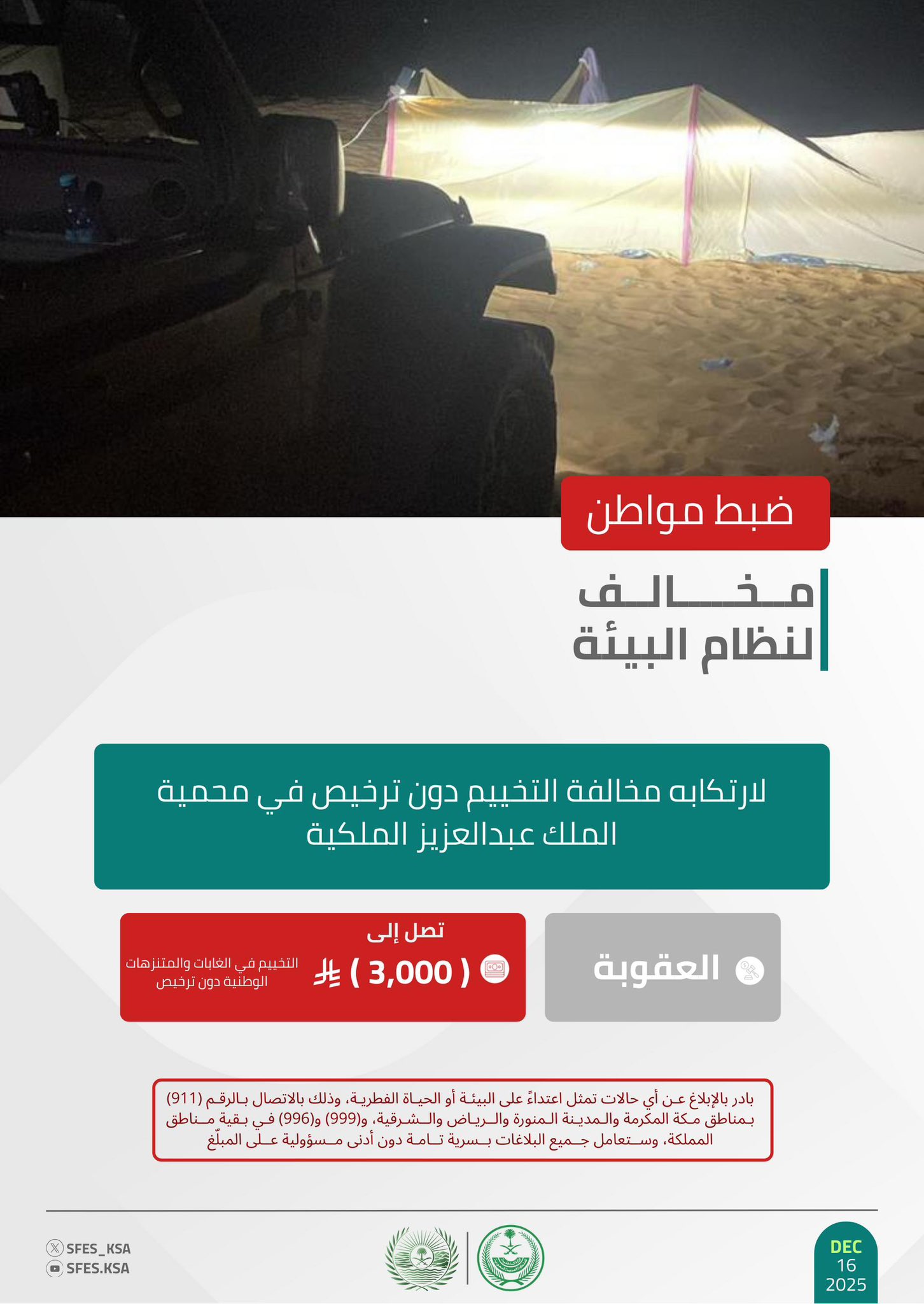 وأوضحت القوات أن عقوبة مخالفة التخييم في الغابات أو المتنزهات الوطنية دون ترخيص غرامة تصل إلى (3,000) ريال، حاثةً على الإبلاغ عن أي حالات تمثل اعتداءً على البيئة أو الحياة الفطرية على الرقم (911) بمناطق مكة المكرمة والمدينة المنورة والرياض والشرقية، و(999) و(996) في بقية مناطق المملكة، وستعامل جميع البلاغات بسرية تامة دون أدنى مسؤولية على المبلّغ.