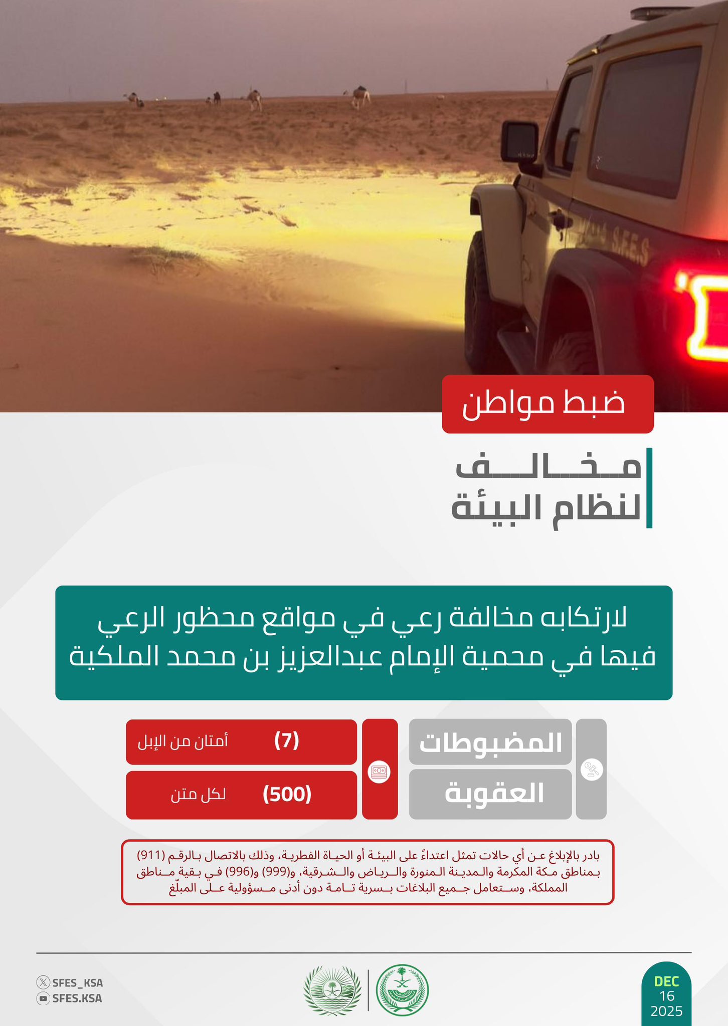 وأكدت القوات أن عقوبة رعي الإبل غرامة (500) ريال لكل متن، حاثةً على الإبلاغ عن أي حالات تمثل اعتداءً على البيئة أو الحياة الفطرية على الرقم (911) بمناطق مكة المكرمة والمدينة المنورة والرياض والشرقية، و(999) و(996) في بقية مناطق المملكة، وستعامل جميع البلاغات بسرية تامة دون أدنى مسؤولية على المبلّغ.